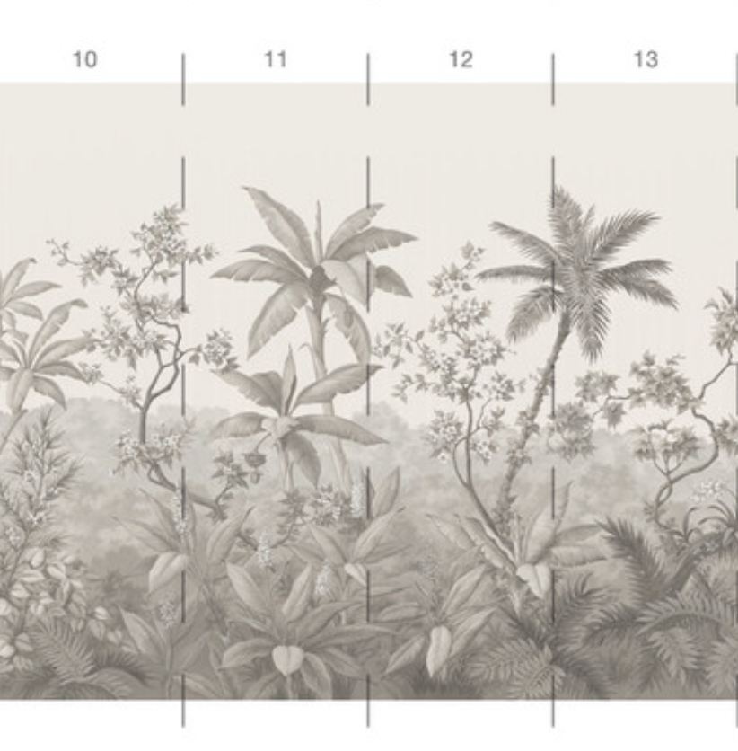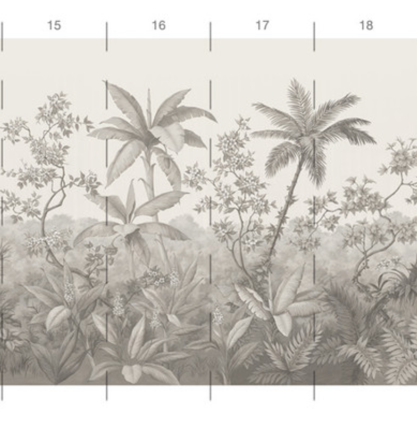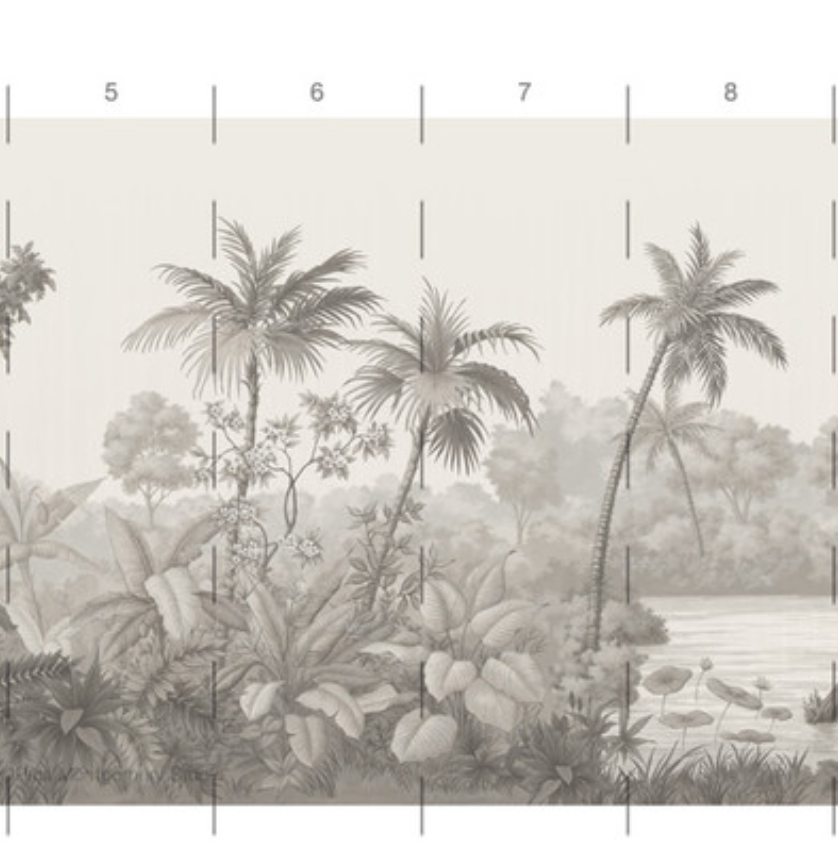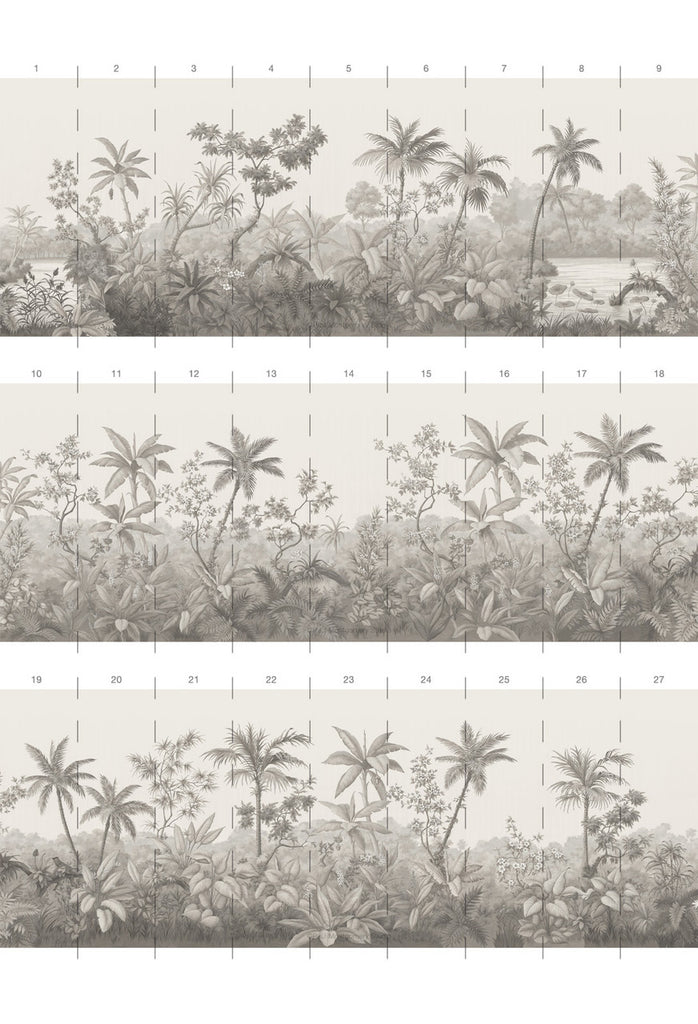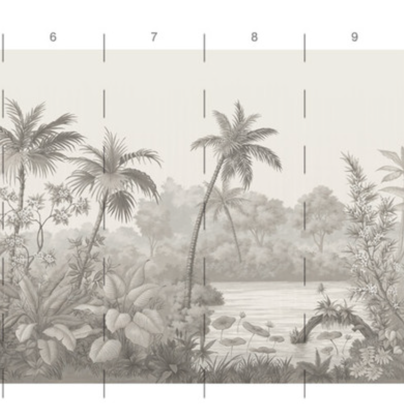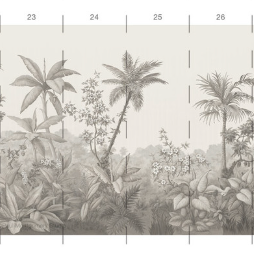 Our Palmera mural is an idyllic landscape of a tropical paradise rendered in Sepia tones. Handsome yet gentle, this view is always an asset to any interior. 27 Panels Available in Full Length/Headers/Footers, Sold in individual Panels, Width: 36", Design Height: 120", Total Height: 108", Palmera,Paul Montgomery Studios