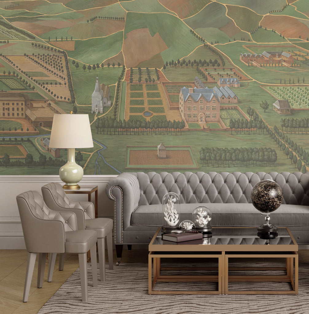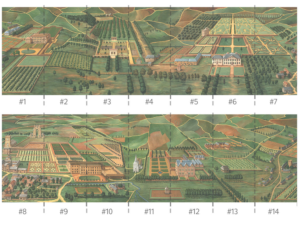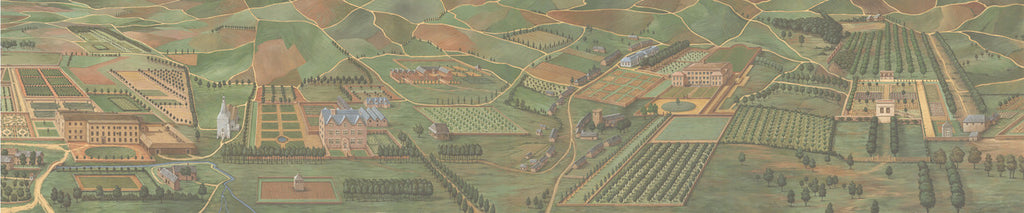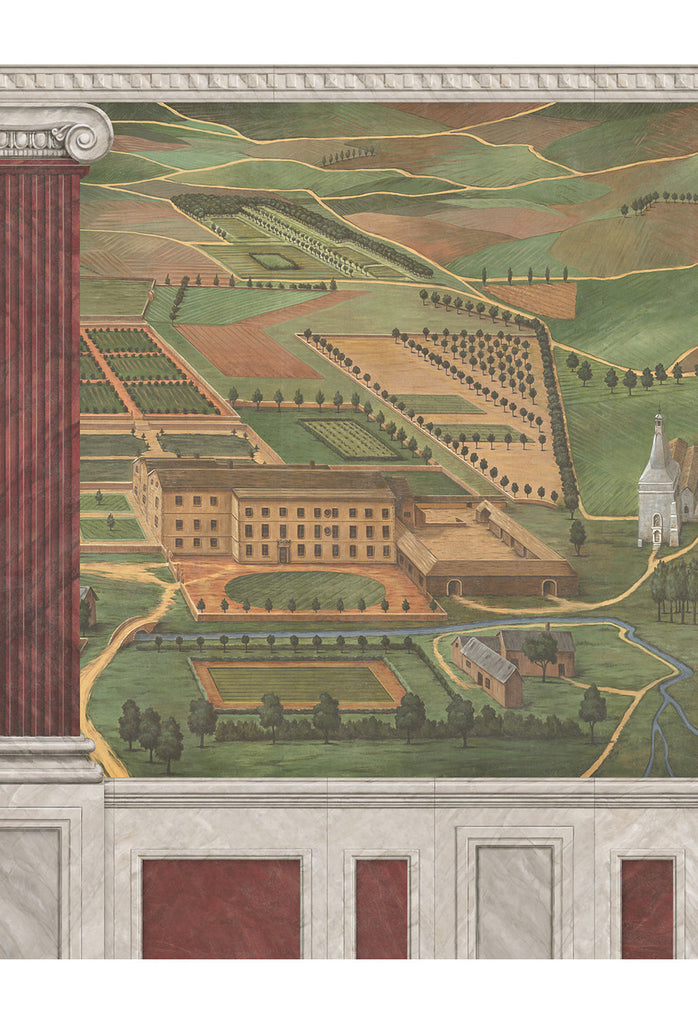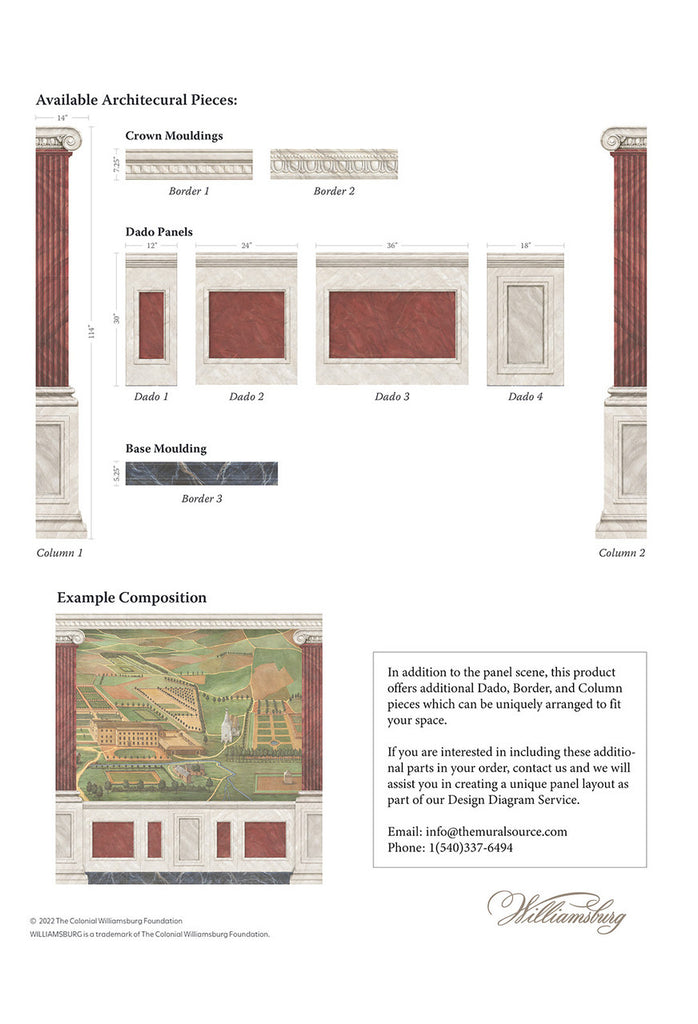 Johannes Kip was a Dutch draftsman, engraver, and print seller who followed King William and Queen Mary from Holland to England after the Glorious Revolution of 1688. During the reign of Queen Anne, he recorded birds’ eye views of 80 British estates with draftsman Leonard Knyff. Their Britannia Illustrata: Or Views of Several of the Queens Palaces, as Also of the Principal seats of the Nobility and Gentry of Great Britain, Curiously Engraven on 80 Copper Plates was published in London in 1708–9. Kip’s and Knyff’s views were incredibly accurate depictions of British estates, especially considering that they did not have the advantage of a hot-air balloon to capture aerial perspectives. Published as black and white engravings, Kip views in the Colonial. Williamsburg collection have been reimagined in color and given a painterly interpretation by the Paul Montgomery studio. The inaugural WILLIAMSBURG Mural Collection X Paul Montgomery re-envisions the rich design archive of Colonial Williamsburg the world's largest living history museum, within a modern sensibility. Sales of WILLIAMSBURG products support Colonial Williamsburg's missions of education, preservation, and engaged citizenship – That the future may learn from the past. 14 Panels / 7 Additional Panels Available in Full Length/Headers/Footers, Sold in individual Panels, Width: 36", Design Height: 76" 72", Total Height: 76" 72", Queen Anne's Views,Paul Montgomery Studios