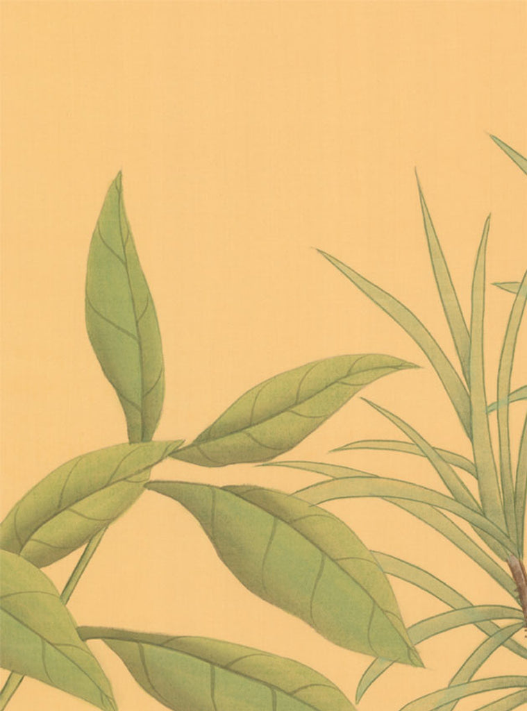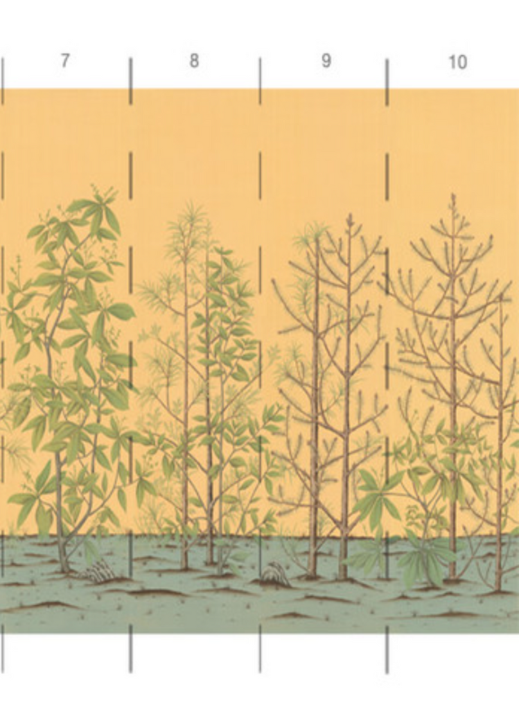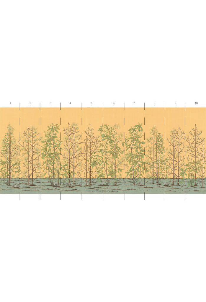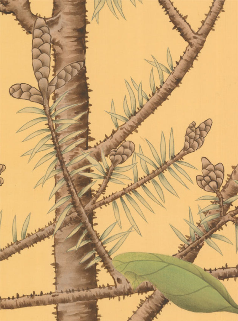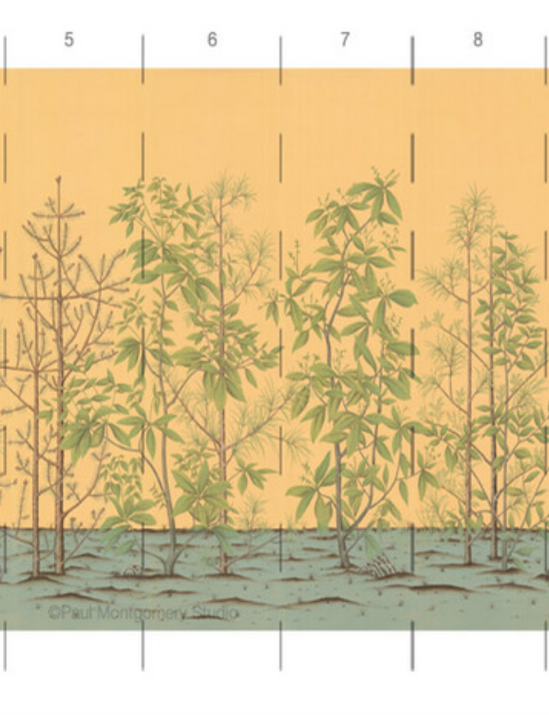 Quiet Forest Gardenia is inspired by an ancient Japanese screen seen at the Freer Gallery in Washington D.C. 10 Panels Available in Full Length/Headers/Footers, Sold in individual Panels, Width: 36", Design Height: 132", Total Height: 120" 108", Quiet Forest Gardenia,Paul Montgomery Studios