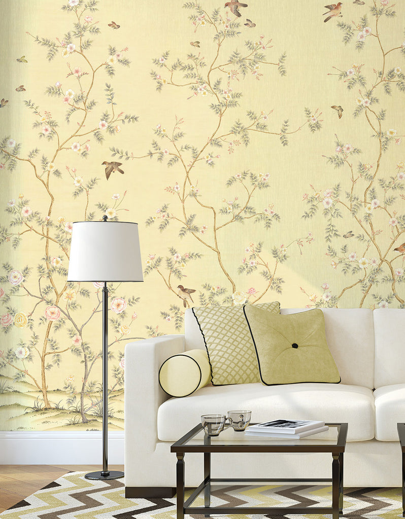 Roses Cream is a chinoiserie mural that showcases colorful birds and a variety of rose bushes and trees. 12 Panels Available in Full Length/Headers/Footers, Sold in individual Panels, Width: 36", Design Height: 120", Total Height: 108", Roses Cream,Paul Montgomery Studios