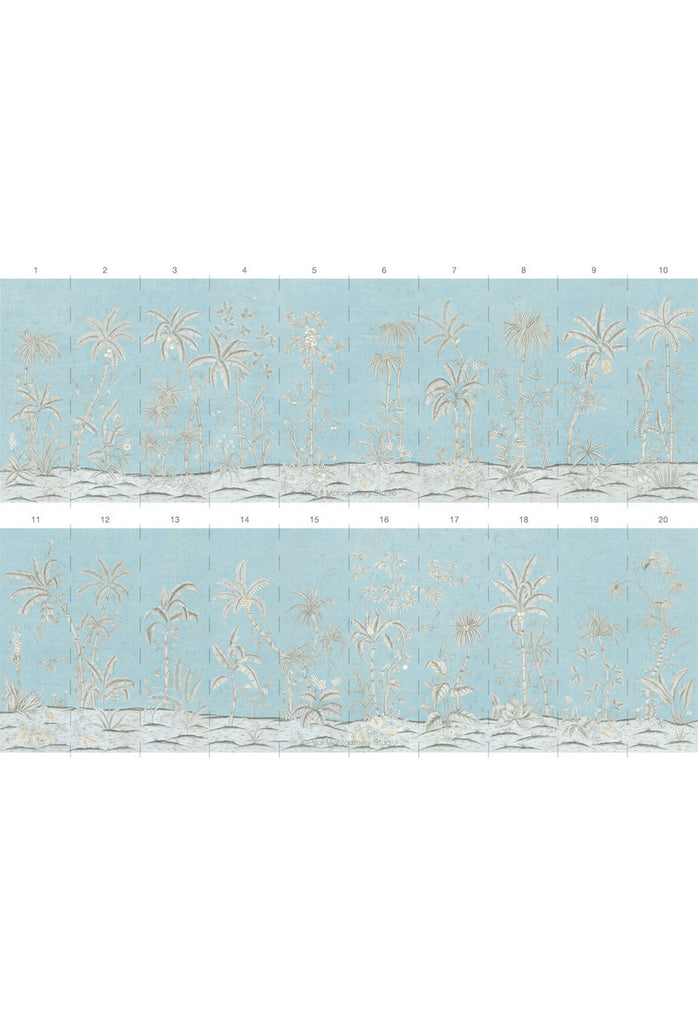 Trevarez Fresco is a chinoiserie mural designed with stately palm trees in a tropical forest with the appearance of an ancient fresco. 20 Panels Available in Full Length/Headers/Footers, Sold in individual Panels, Width: 36", Design Height: 120", Total Height: 108", Trevarez Fresco,Paul Montgomery Studios