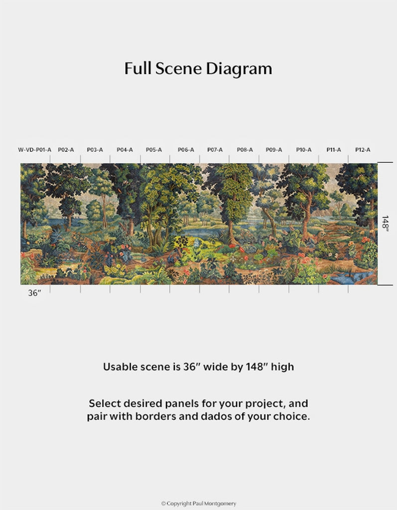 Over her lifetime, Michelle has amassed a collection of Verdure Tapestries and tapestry fragments, acquiring her first piece while living in Rome. This Garden of Eden incorporates motifs from her collection into a beautiful, perfect, greenscape. Printed on nonwoven ground. This Mural Source design can add visual interest or color to a bedroom, living room, or any room in your apartment or home; wall covering mural has various panels, patterns and modular elements for custom arrangement. The Verdure design is a dramatic addition to any room. 12 Panels / 10 Additional Panels Available in Full Length/Headers/Footers, Sold in individual Panels, Width: Various, Design Height: Various, Total Height: Various, Verdure Tapestry,Paul Montgomery Studios
