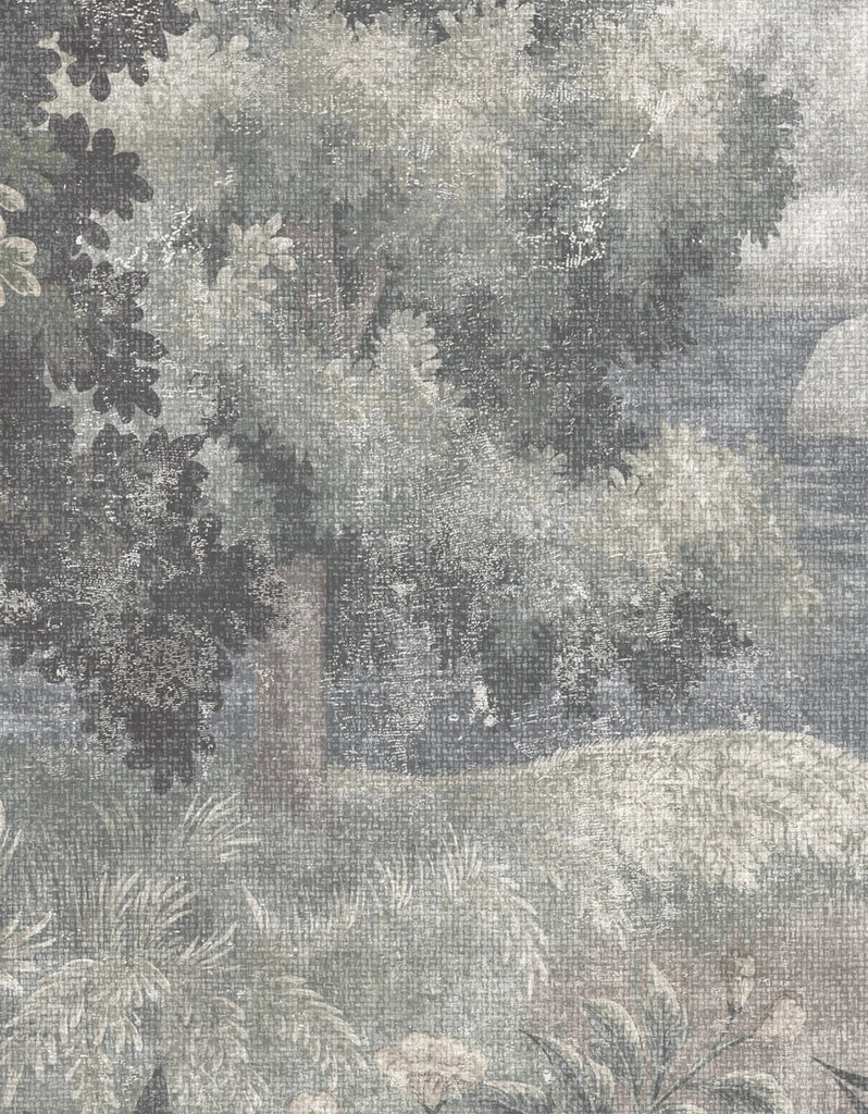 A sophisticated mural featuring lush foliage and intricate botanical elements in soft grisaille grey tones, embodying timeless elegance by Paul Montgomery Studios. Perfect for refined interiors seeking nature-inspired artistry. #luxurywallcoverings #interiorstyle #artisticwalls