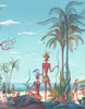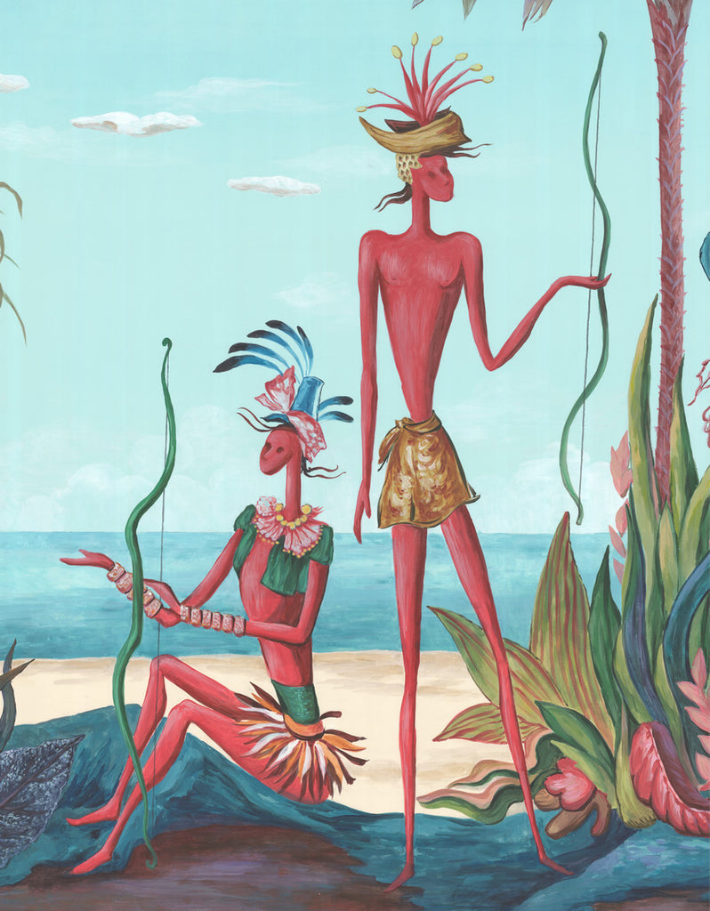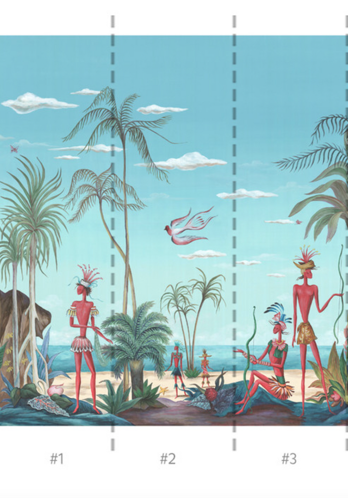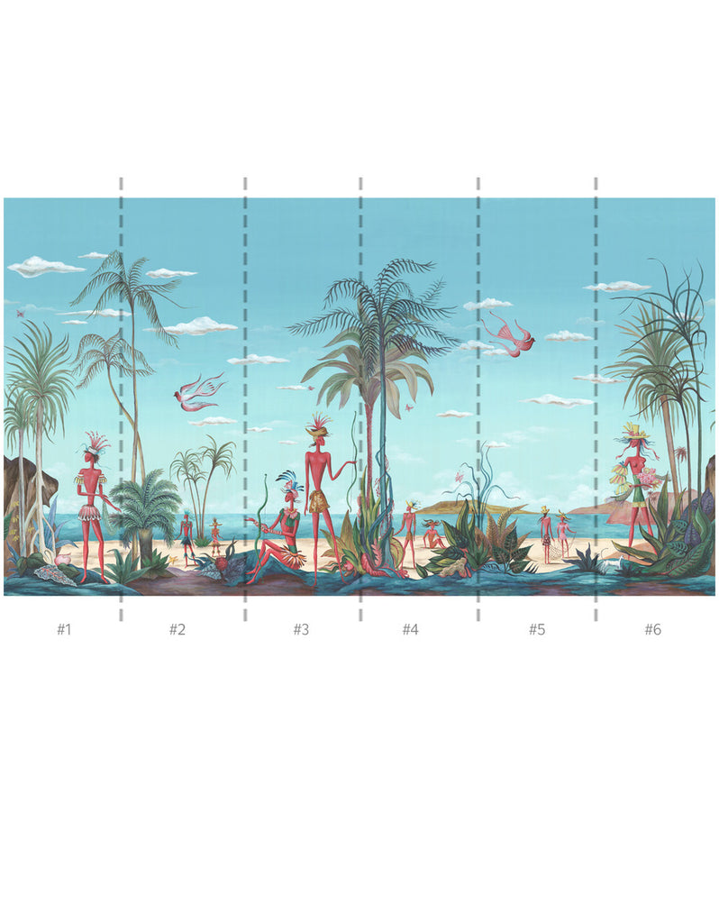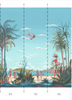 Island Reverie evokes the allure of a tropical coastline. Figures walk along the fantastical trees and foliage that line the sandy beaches, while dramatized birds and butterflies flutter overhead. The colors displayed by the stylized life forms invoke the color palette of a daydream with rich colors throughout. This mural is perfect for a lively setting, bringing a stunning backdrop to social events and making any interior a transport to the sea.This mural is perfect for a lively setting, bringing a stunning backdrop to social events and making any interior a transport to the sea. Panels Available in Full Length/Headers/Footers, Sold in individual Panels, Width: , Design Height: , Total Height: , Island Reverie,Paul Montgomery Studios