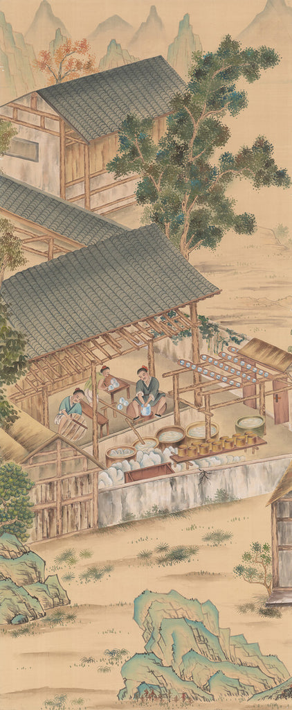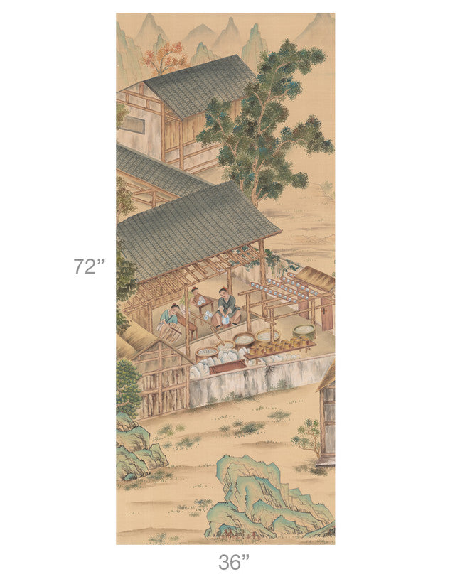 Porcelain Masters is a panel from the Paul Montgomery "Antiquities" collection. The scene depicts the ancient process and craft of the porcelain makers. The panel measures 30" wide by 72" tall.