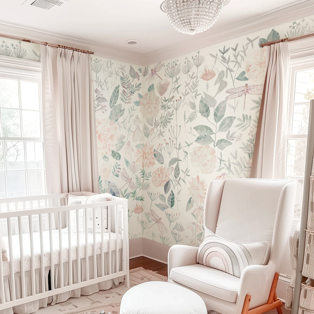 An exquisite design featuring a watercolor floral pattern in pastel pink, mint green, and grey tones, adorned with dragonflies and wildflowers on a white background. This soft and sophisticated design, inspired by various artists, is perfect for interior wallpaper. With its muted colors and dreamy atmosphere, it is ideal for nursery decor or any space in need of serenity and natural beauty. Additionally, the cottagecore style adds a charming, cozy countryside appeal to any room.