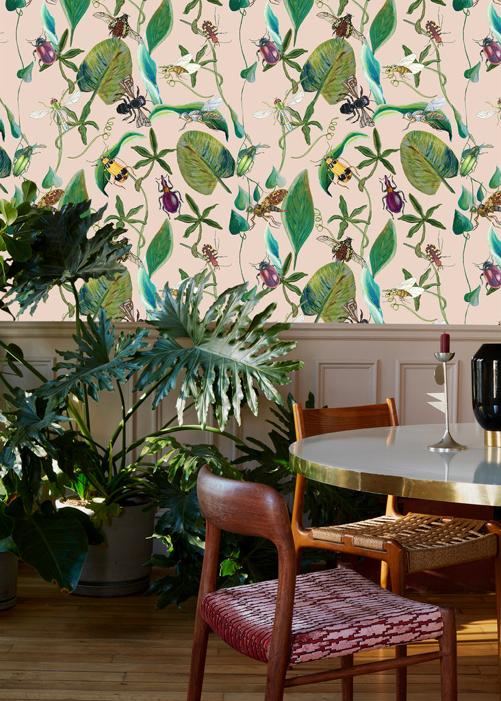 Flourishing Flora Pink Wallpaper | Catchii Netherlands Europe Blooming flowers and plants attract insects. Bring nature into your home with this lush wallpaper full of life and colour. Discover all the insects, with all their beautiful details, on this vibrant wallpaper.