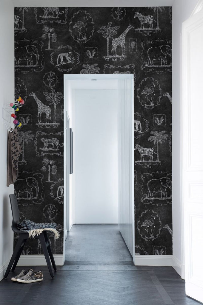 Whimsical hand-drawn animals gather on a chalkboard-black backdrop in "Animal Party, Blackboard Wallpaper" by Rebel Walls. A playful yet sophisticated choice for creative spaces. #wallartdecor #luxuryinteriors #creativewalls #designerwallcoverings