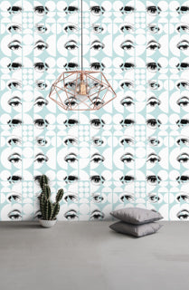 Eyes And Circles Sky Wallpaper by Mind the Gap features a whimsical design of stylized eyes within soft geometric circles in soothing sky-toned blues. A surreal, celestial-inspired pattern that adds depth and imagination to any space. #interiors #luxurywalls #artfuldecor