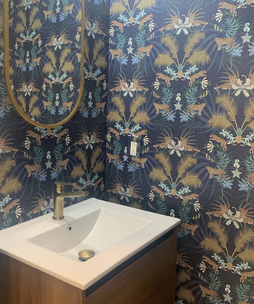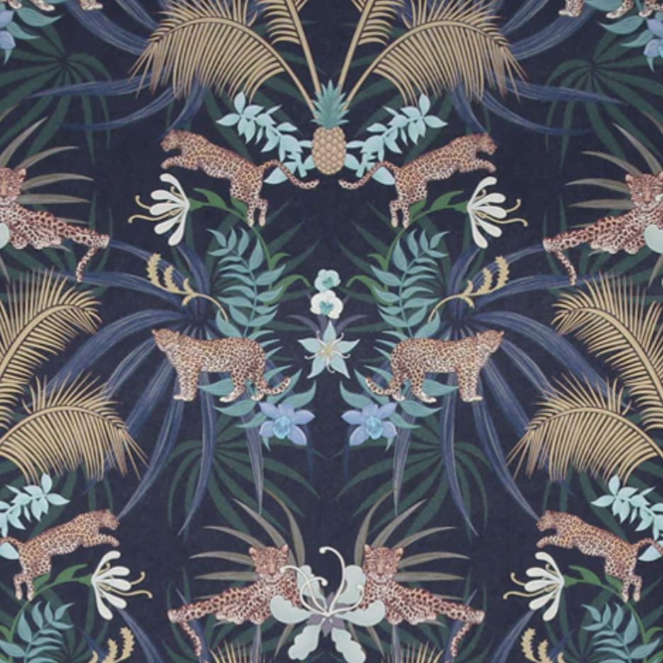 The ‘Leopard Luxe’ wallpaper collection was borne of Becca’s love of juxtaposing wildlife amongst ornament. With leaping leopards amongst golden palms and pineapples, the result is a majestic design of striking elegance, which creates a beautiful focal point in an interior.