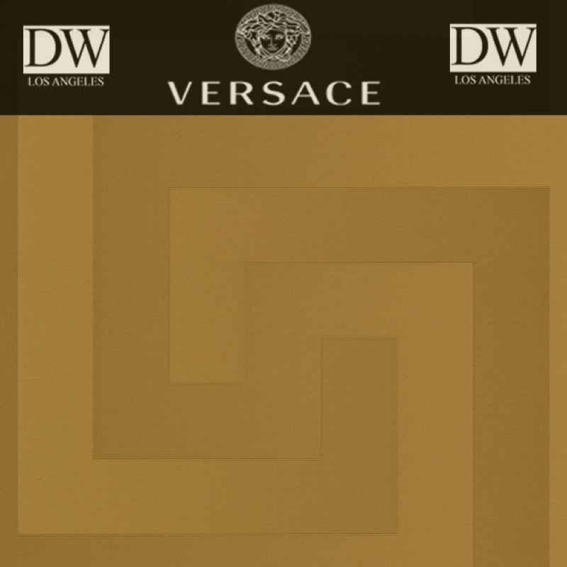 The Greek Key | Versace Wallpaper features a sophisticated, interlocking geometric pattern in rich gold tones that evoke timeless elegance and luxury. Perfect for adding a refined statement to any space. #luxurywallpaper #elegantdesign #VersaceWallcoverings