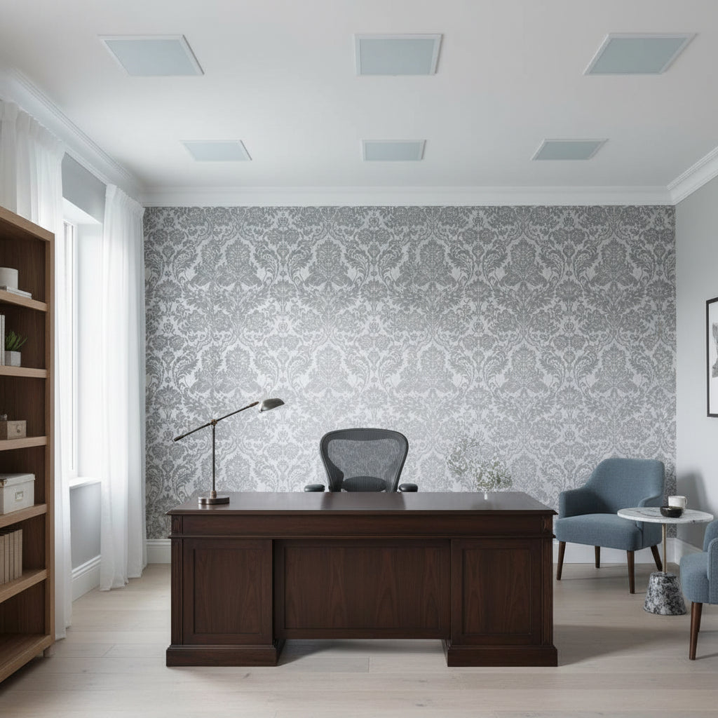 Diana Velvet Flock Damask Grey and Silver combines a rich, intricate motif with a warm feel. The light background allows the stunning pattern to display its full stunning effect, making it a rich and attention grabbing design. Quick & easy 'Paste The Wall' application (no decorating table or pre-cutting required). Non-woven wallcovering, won't shrink or expand overtime.Designer Wallcoverings and Fabrics is a leading authorized dealer of Gothic Damask Flock Grey and Silver Wallcovering