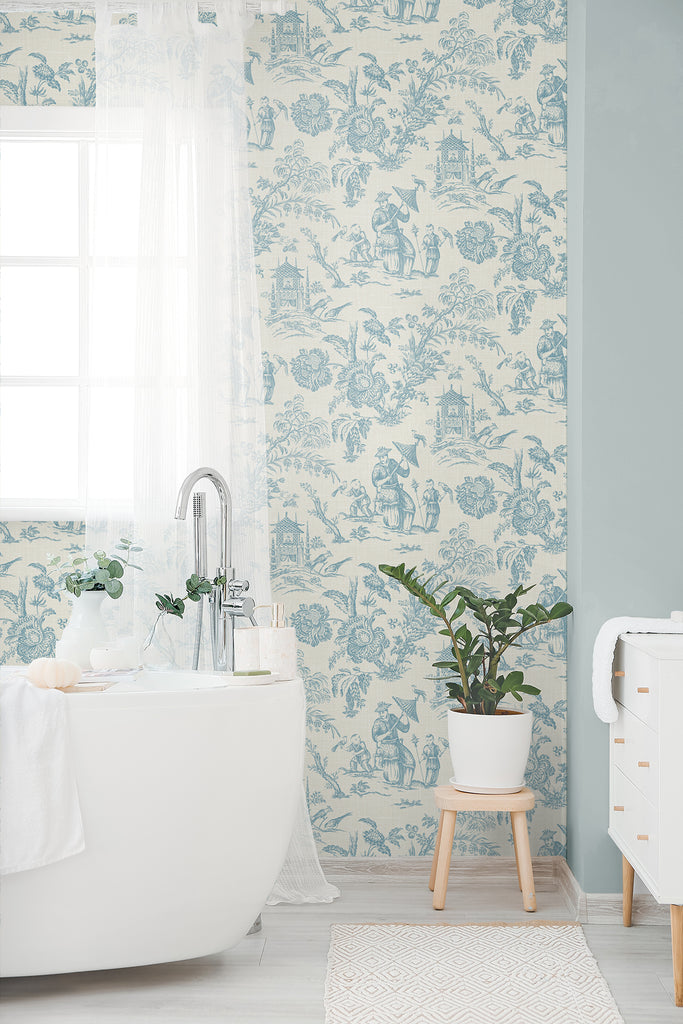 Malibu Colette Chinoiserie Wallpaper in Bleu Bisque features delicate Country Toile scenes, blending intricate floral motifs and classic pastoral imagery for a timeless, refined ambiance. Perfect for elegant interiors. #classicwallcoverings #chinoiseriechic #luxuryinteriors