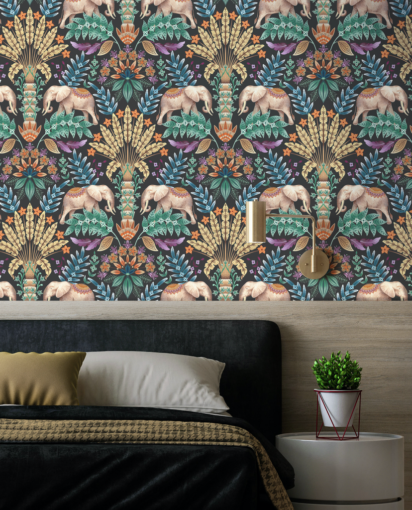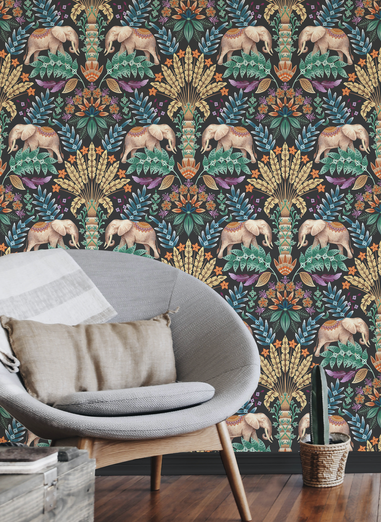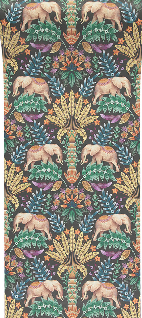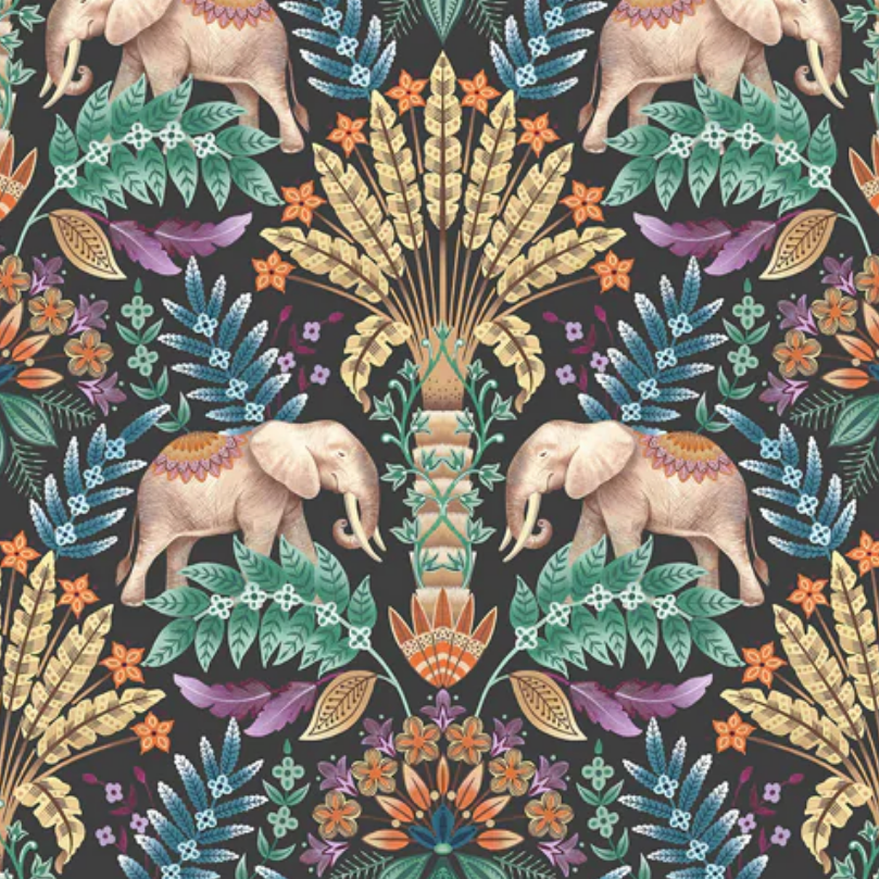 A vibrant design from Richard Hayley with an abundance of lush tropical palms surrounding a pair of magnificent elephants, all hand illustrated in a decorative style reminiscent of the exotic. The colourful palette, set upon a rich charcoal background, creates an air of luxury and opulence. This wallpaper is sure to transport you faraway lands.