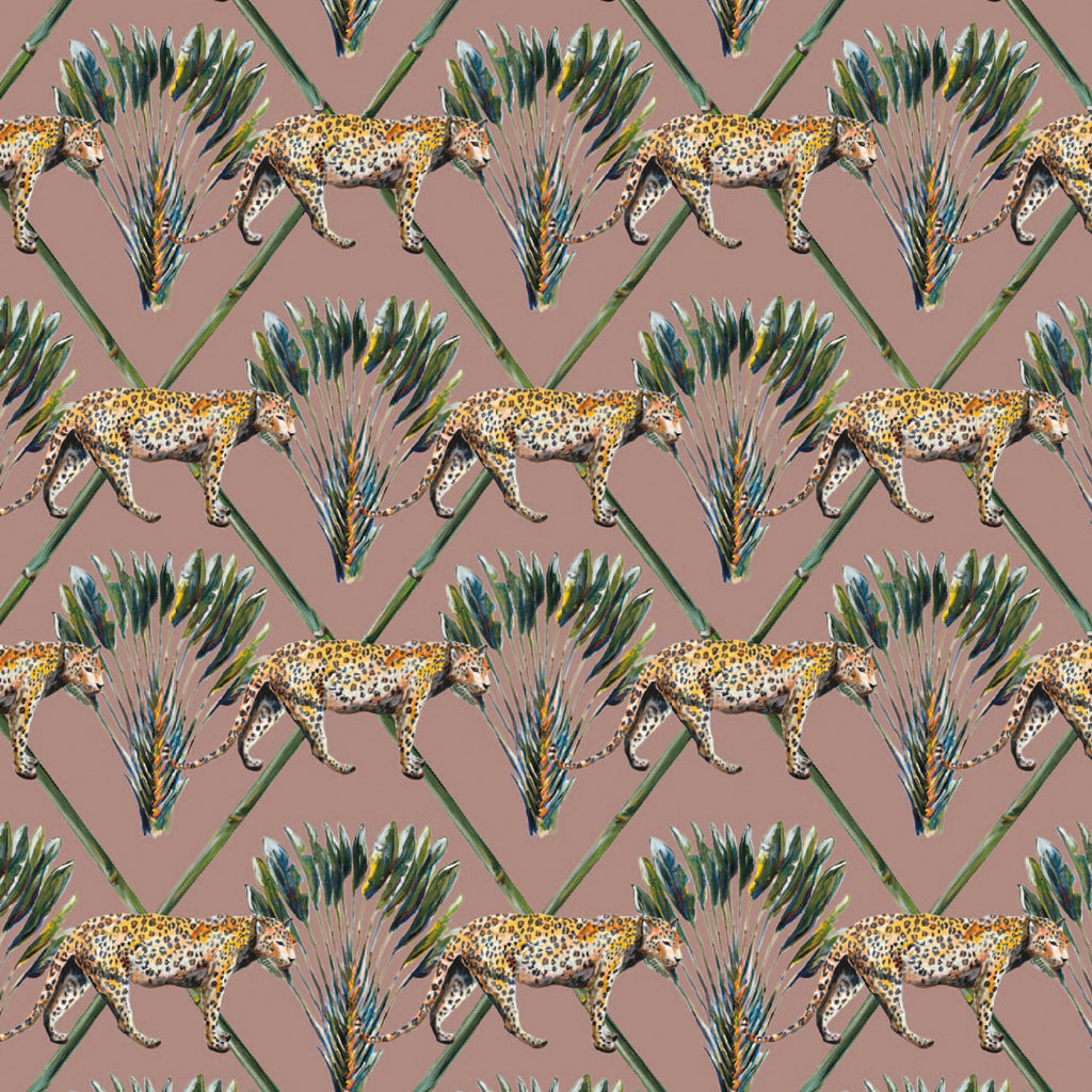Graceful panthers roam among soft blush pink palms in this elegant design by Catchii Netherlands Europe. A chic tropical touch. #homedecorstyle #luxurydesign #wallartdecor