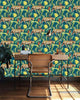 Wild Jungle Blue Wallpaper | Catchii Netherlands Europe This wallpaper design will make you smile. The cute monkeys, toucans and colorful leaves and flowers will bring back memories of a vacation in the jungle. This wallpaper design is a tropical getaway with its lush vegetation and exotic wildlife.