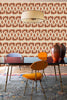 Madagascar Palm Terracotta Wallpaer | Catchii Netherlands Europe The picturesque pattern is inspired by the palm of Madagascar. It has been given the name “travellers wavy palm” because the leaves collect rainwater that flows into the stems of the plant, ready to help a thirsty traveler. These palms grow enormous. The leaf bases create a playful wavy pattern. Give your interior character with this spectacular design on the wall.