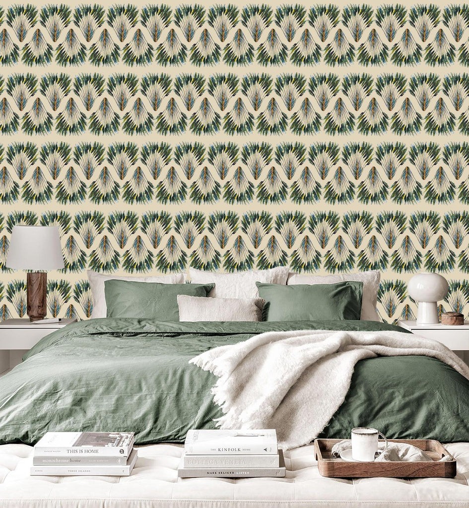 Madagascar Palm Green Wallpaer | Catchii Netherlands Europe The picturesque pattern is inspired by the palm of Madagascar. It has been given the name “travellers wavy palm” because the leaves collect rainwater that flows into the stems of the plant, ready to help a thirsty traveler. These palms grow enormous. The leaf bases create a playful wavy pattern. Give your interior character with this spectacular design on the wall.