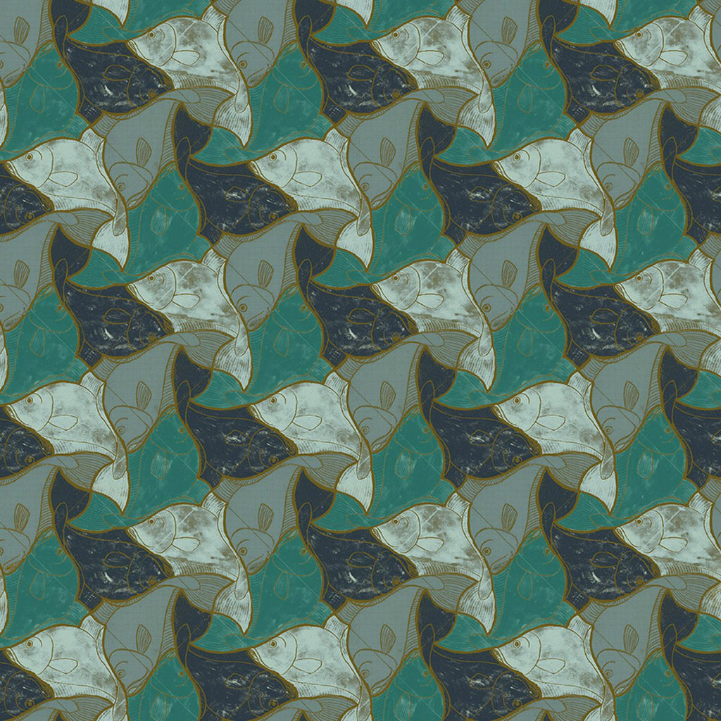 Intricate fish motifs interlock seamlessly in dark green tones, creating a mesmerizing, Escher-inspired visual. A true statement. #artinspiredwalls #luxuryinteriors #modernwallcoverings