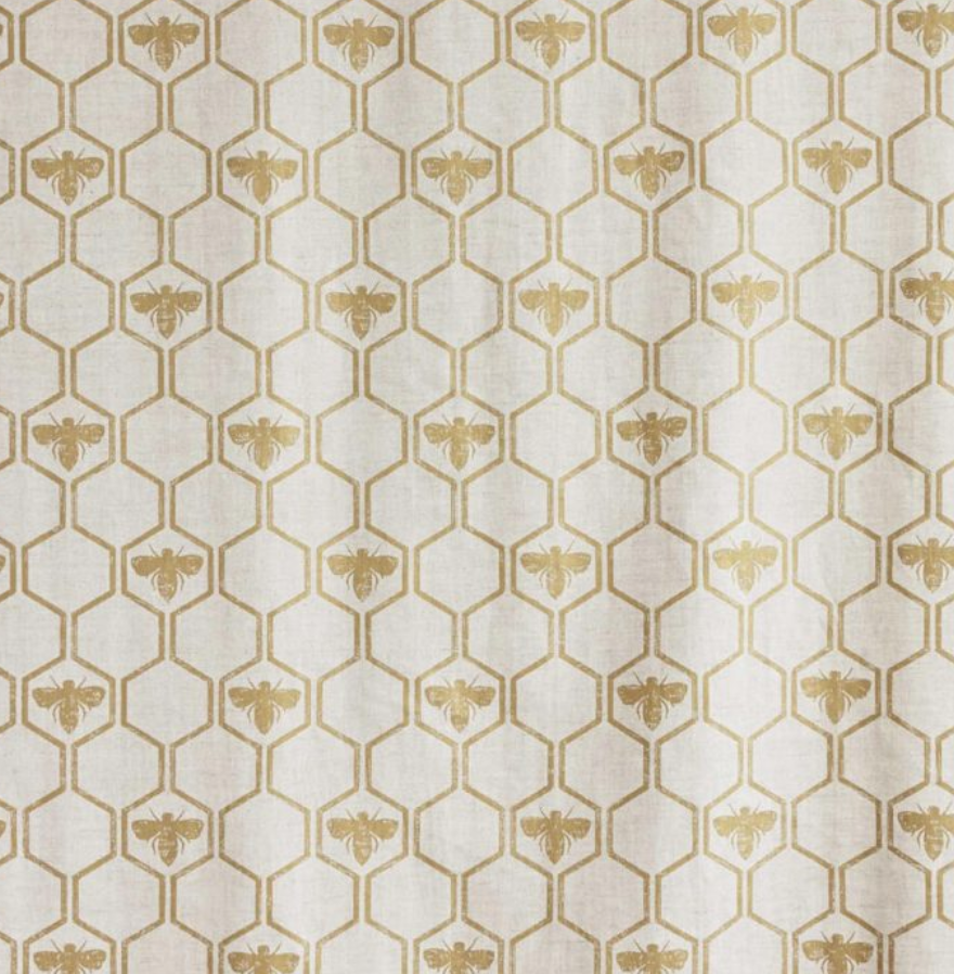 A geometric honeycomb interspersed with bees, printed on natural un-dyed linen cotton.