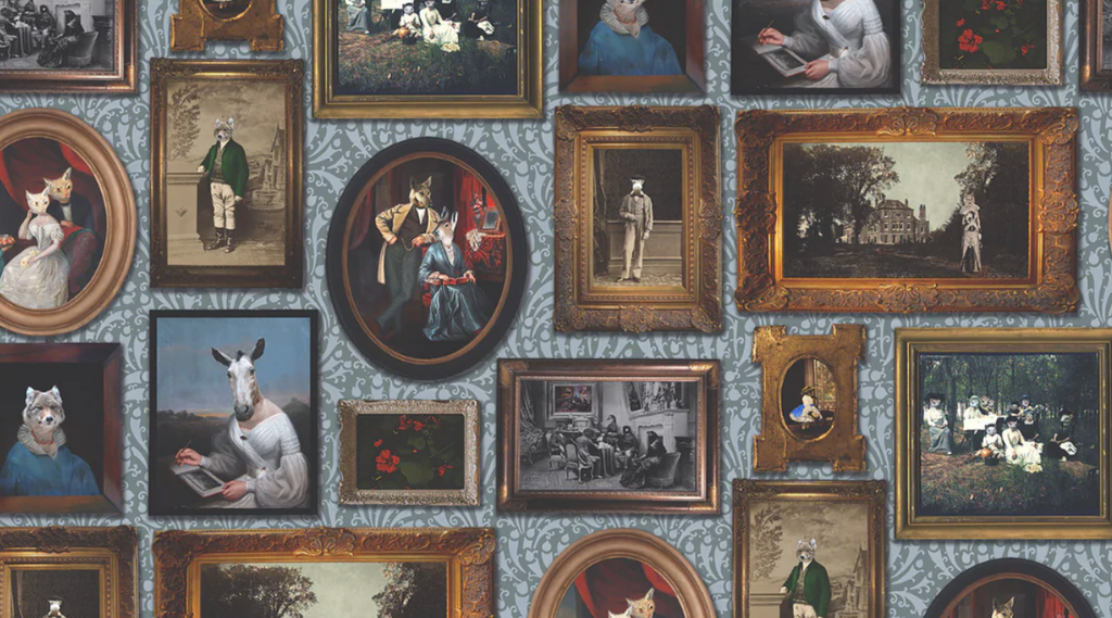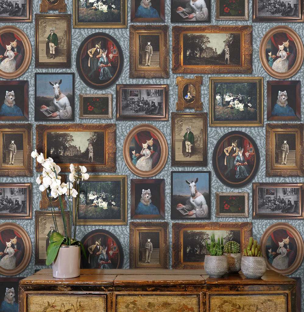 The art gallery wallpaper contains a background created from an original 19th century, intricately carved wooden wallpaper block that Charlotte has had hanging above her printing press. The collection of paintings featured in the wallpaper are original works of art by Charlotte. Several of these work have been shown at the Royal Academy Summer exhibition, with the the Lady Wolf portrait being exhibited at the 2019 Summer Exhibition. A wonderful way of having a handsomely framed paintings on your wall.