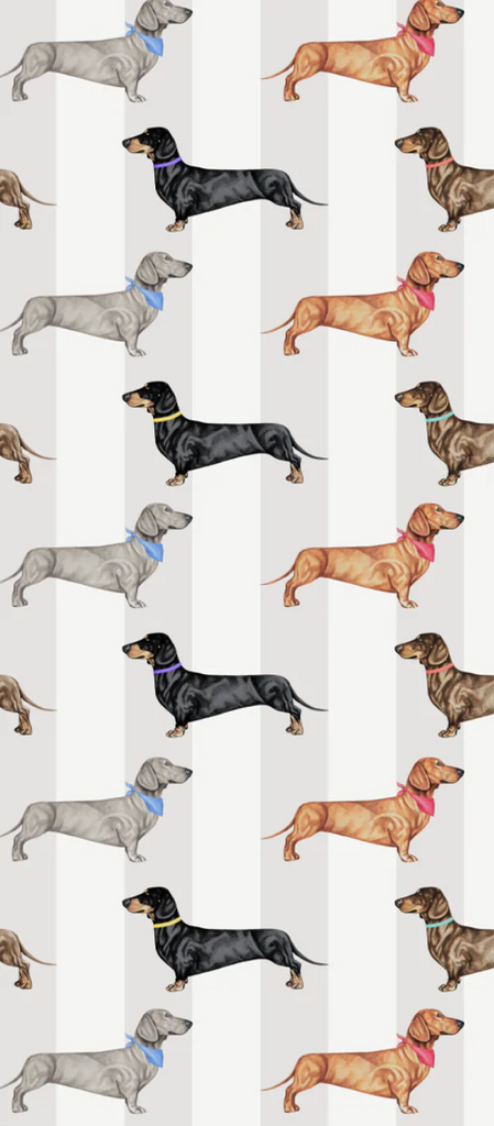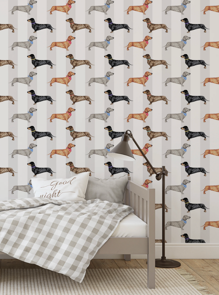 Charming dachshunds in playful poses repeat across a soft neutral backdrop in "Dachshund Dog Wallpaper" by Graduate Collection UK. A whimsical touch for refined spaces. #luxurydesign #wallart #uniquewalls