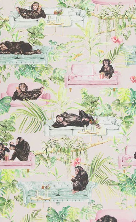This bold jungle design is set on a pink background with tropical palm trees with cheeky monkeys chilling out eating popcorn and drinking cocktails!