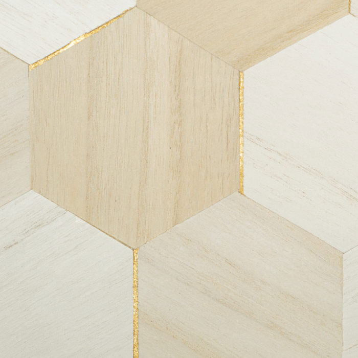 Inspired by the structural integrity of a natural beehive, Ajiro Honeycomb elicits a feeling of balance and well-being. Multi-hued hexagonal shapes of paulownia wood are hand-painted and inlaid in an organic, free-flowing pattern. A metallic accent perfectly enhances this sustainable and flexible surfacing material.