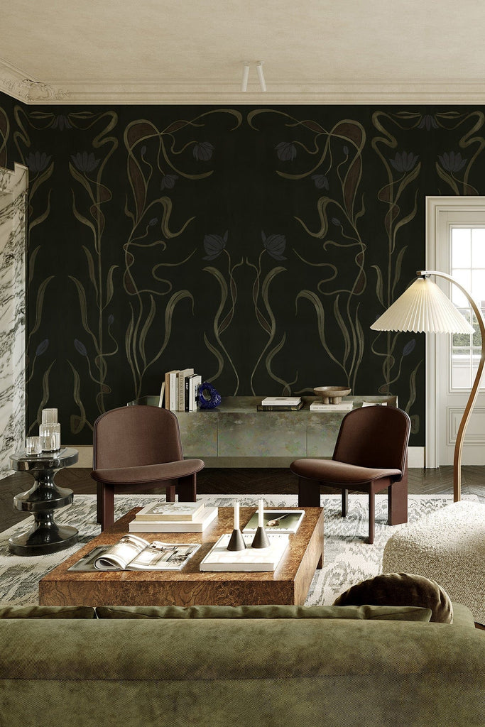 An expressive floral pattern with sensual lines and dark drama. Inspired by Art Nouveau’s love for organic shapes and flowing movement. With a near-mystical presence, it adds artistic depth to any space. Every detail is hand-drawn, offering a sense of authenticity and craftsmanship. Pair with muted textiles, antique furniture, and contrasting materials for maximum impact.