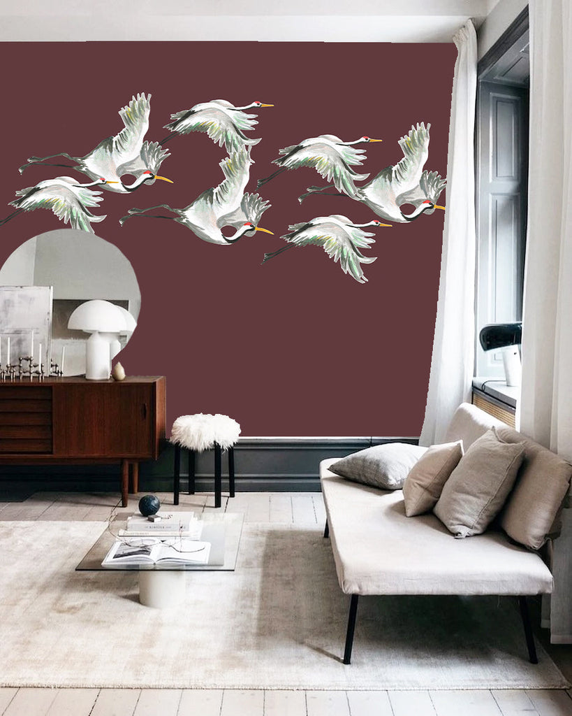 Flying Cranes Bordeaux Red Mural | Catchii Netherlands Europe