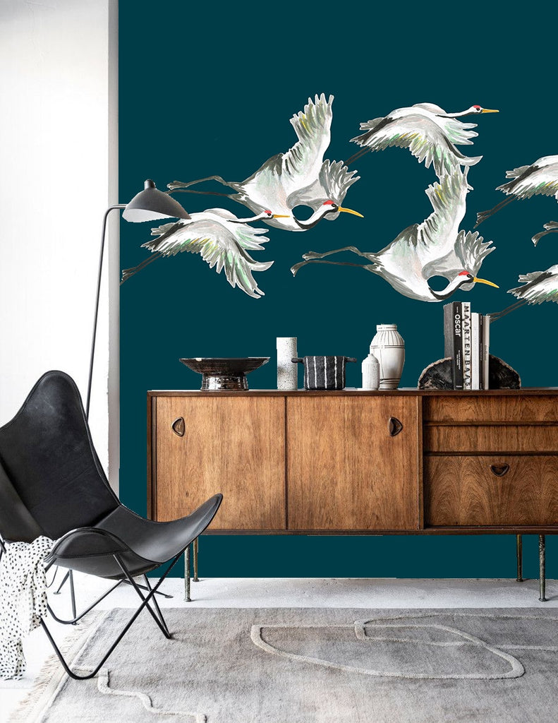 Elegant dark blue mural featuring graceful flying cranes in motion, capturing a serene and sophisticated ambiance. A perfect statement piece by Catchii Netherlands Europe. #luxuryinteriors #wallmural #designerwalls