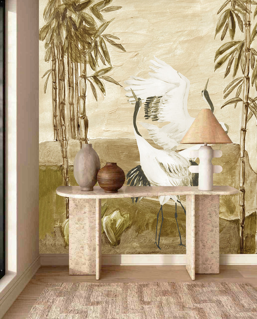Japandi Cranes Sepia Mural | Catchii Netherlands Europe