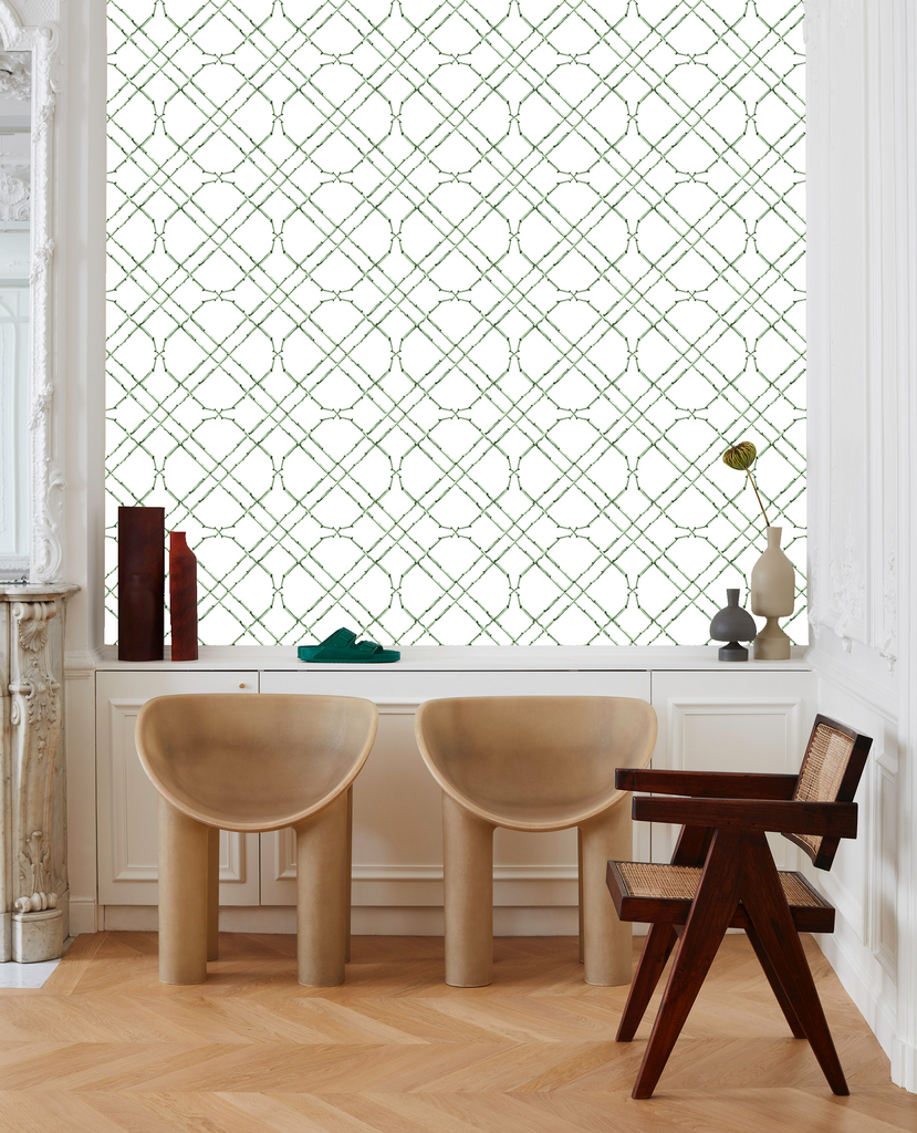 Bamboo Trellis Olive Green Wallpaper | Catchii Netherlands Europe Bamboo trellis is usually seen in an abundance of outdoor spaces. Femke loves these bamboo trellis and created this delicate pattern. This wallpaper is not only a beautiful backdrop for your living spaces but also adds sophistication and a natural feel indoors without drawing too much attention.