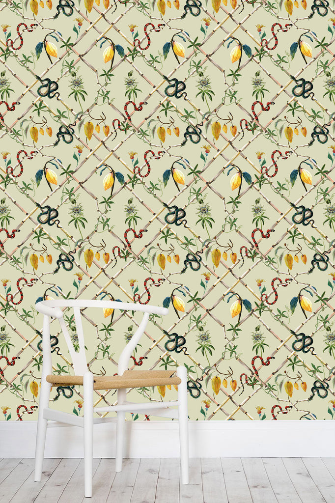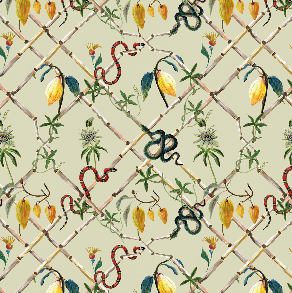 Cacao Estate Light Green Wallpaper | Catchii Netherlands Europe The jungle is filled with tropical vegetation. Inspired by the rainforest of Ivory Coast with its varied colorful flora and fauna. The cocoa tree is an evergreen tree. Imagine yourself in the lush jungle, originally drawn by Femke.