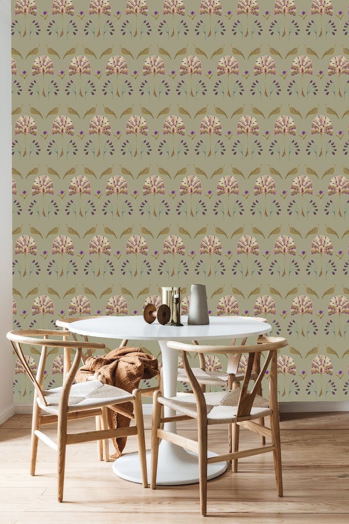 Jaipur Flowers Grey Green Wallpaper | Catchii Netherlands Europe The detailing of the architectural walls and pillars of buildings in India is exceptional. Inspired by this exciting art and beautiful architecture, Femke created this magical wallpaper.