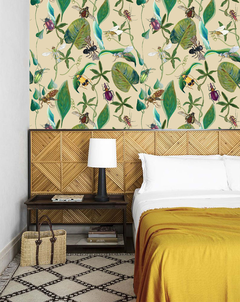Flourishing Flora Beige Wallpaper | Catchii Netherlands Europe Blooming flowers and plants attract insects. Bring nature into your home with this lush wallpaper full of life and colour. Discover all the insects, with all their beautiful details, on this vibrant wallpaper.
