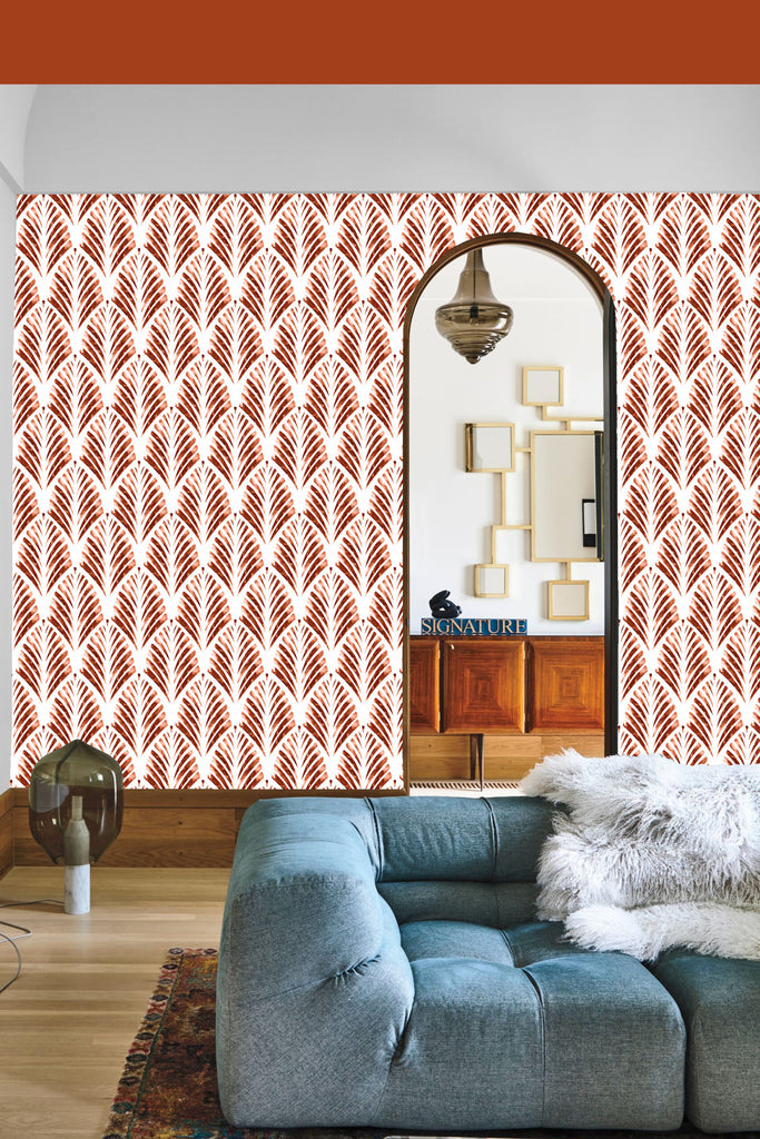 Isabelle Watercolor Leaves Terracotta Wallpaper | Catchii Netherlands Europe The delicate and simple leaf pattern brings sophistication and a natural feeling indoors. Elegant curves of the leaves are timeless and refined, making this wallpaper design a harmonious image.