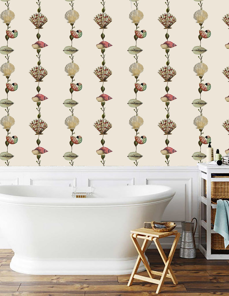 Kelp Antiqua Beige Wallpaper | Catchii Netherlands Europe Discover the elegant grace of underwater seaweed and shells. The illustrations bring the movement of aquatic animals into your room. Enjoy this wallpaper design full of details and color.