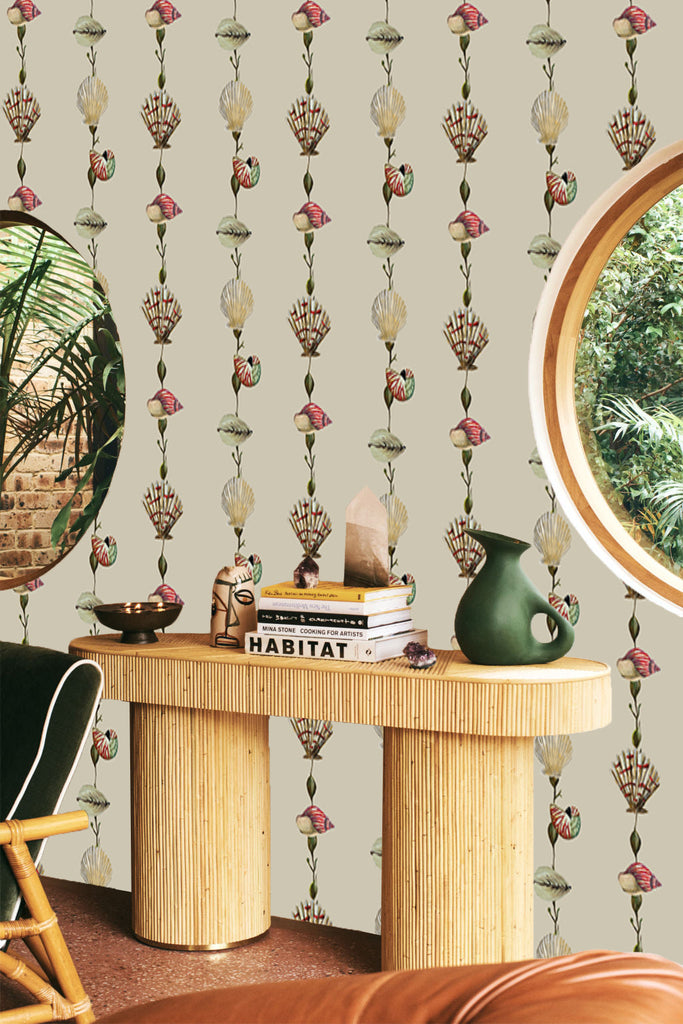 Kelp Antiqua Sand Wallpaper | Catchii Netherlands Europe Discover the elegant grace of underwater seaweed and shells. The illustrations bring the movement of aquatic animals into your room. Enjoy this wallpaper design full of details and color.