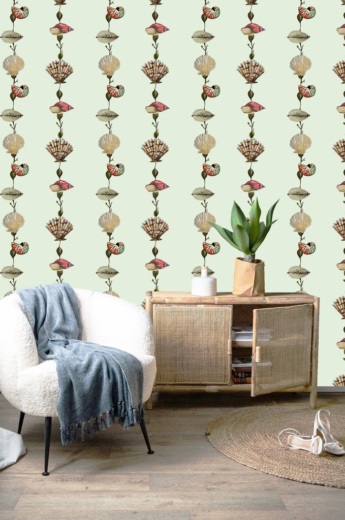 Kelp Antiqua Blue Wallpaper | Catchii Netherlands Europe Discover the elegant grace of underwater seaweed and shells. The illustrations bring the movement of aquatic animals into your room. Enjoy this wallpaper design full of details and color.