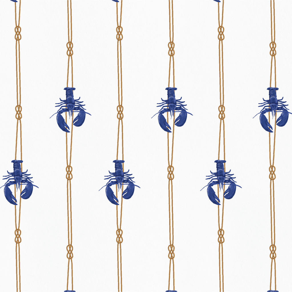 Playful lobsters in crisp blue tones swim across a soft backdrop, bringing breezy Mediterranean charm to any space. #coastaldecor #luxurywallpaper #homestyling