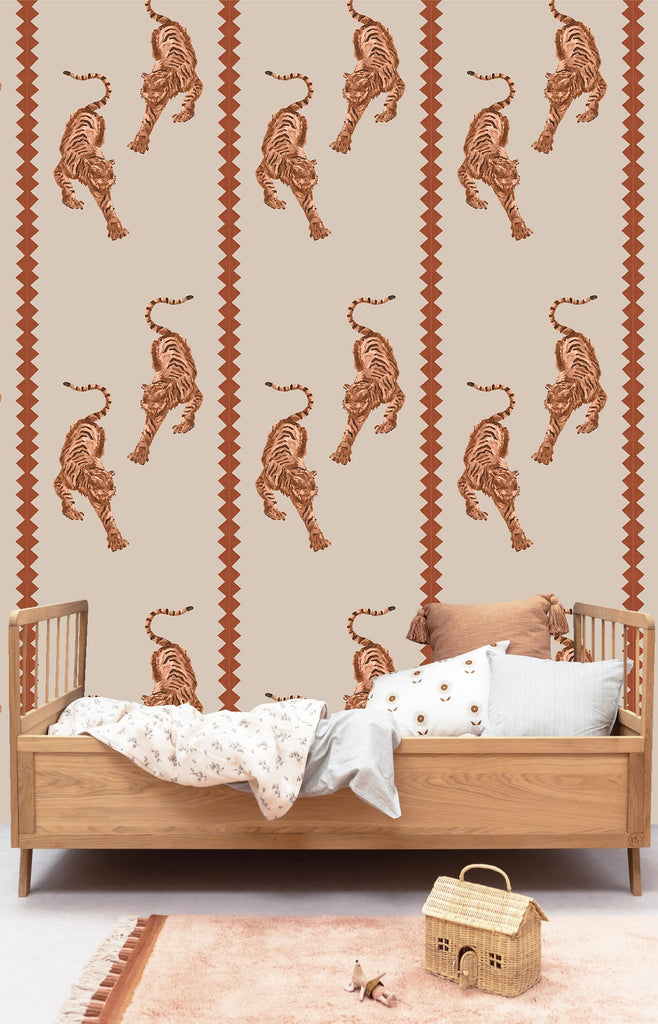 Tiger Panthera Terracotta Wallpaper | Catchii Netherlands Europe The tiger is always a favorite. The flexibility and strength of this animal make a beautiful background for this wallpaper. Discover the details of these original hand-painted designs.