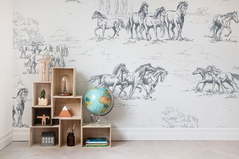The Horse Herd Wallpaper by Rebel Walls features a dynamic scene of wild horses in motion, rendered in monochrome tones that evoke elegance and natural beauty. Ideal for bringing a sophisticated, lively spirit to any space. #WallStyle #ElegantInteriors #ArtisticWalls