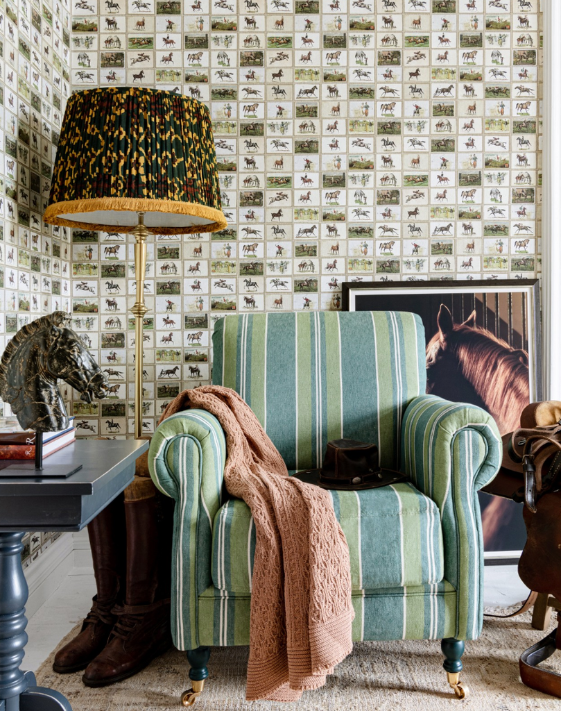 Vintage postage stamps meet equestrian elegance in this refined wallpaper by Mind the Gap. A timeless statement. #luxurywalls #equestrianstyle #wallartdesigns