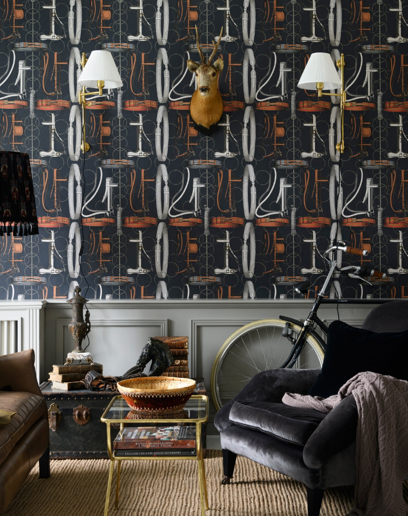 Dark wallpaper featuring detailed equestrian equipment illustrations, blending classic charm with a sophisticated, moody palette. Perfect for adding timeless elegance to interiors. #luxurydecor #wallcoveringdesign #elegantinteriors