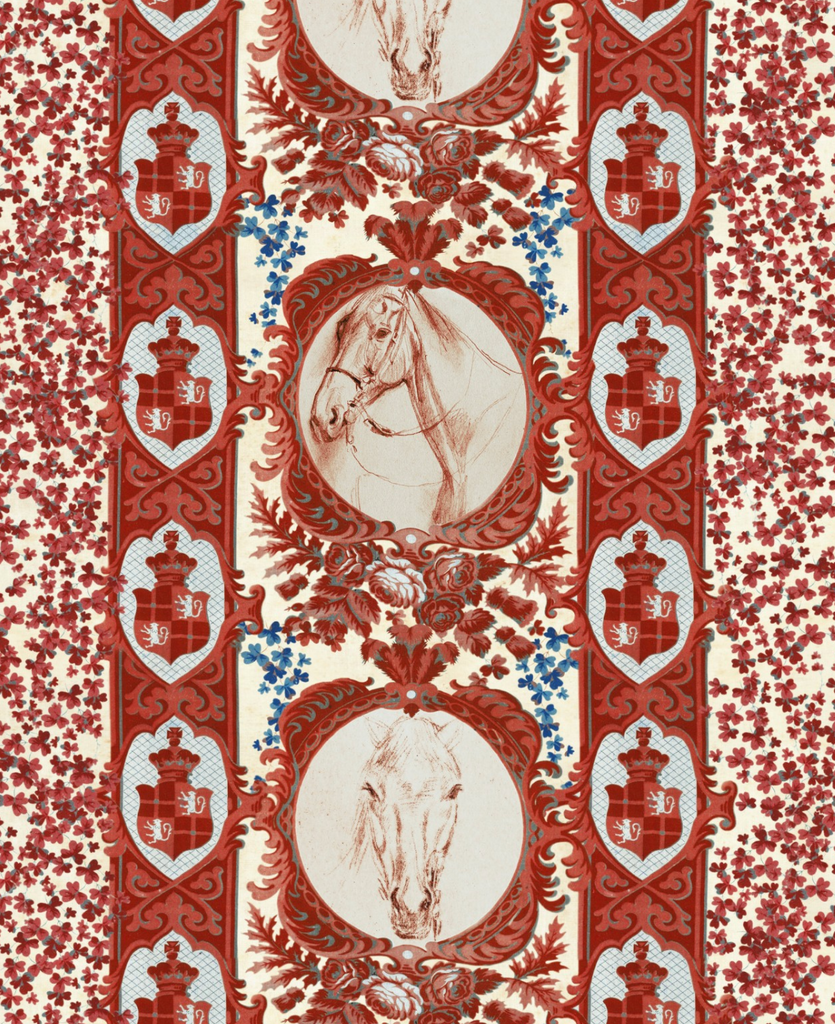 Immortalise the most handsome of horses and frame their luxurious manes, shining coats and long lashes with COMPETITION PANEL, which awards the best in show rosette to a pair of exquisite equines. A pattern embodying the formality of fine portraiture, each hand sketched head is decorated by British florae, with delicate roses, thistles and ferns entwined in the extravagant frame. Stately coats of arms make up a subtle linear stripe alongside the illustrations, while minature painterly petals make up the supporting striped background, available in either a rich red tone with contrasting blue floral details, or vice versa. All Mind The Gap wallpapers are made on new generation non-woven substrate. Printed with eco-friendly inks, Mind The Gap wallpaper are easy to install on any wall type. When hanging the wallpaper, apply the ready-mix adhesive paste on the wall and hang the strips one by one by butting the edges together. The adhesive allows for a while moving the wallpaper strips, so that the wallpaper pattern continues correctly from one strip to another. All our wallpapers are tested and certified for fire rating according to the international legislation. More information and official reports regarding the fire rating are available on demand.