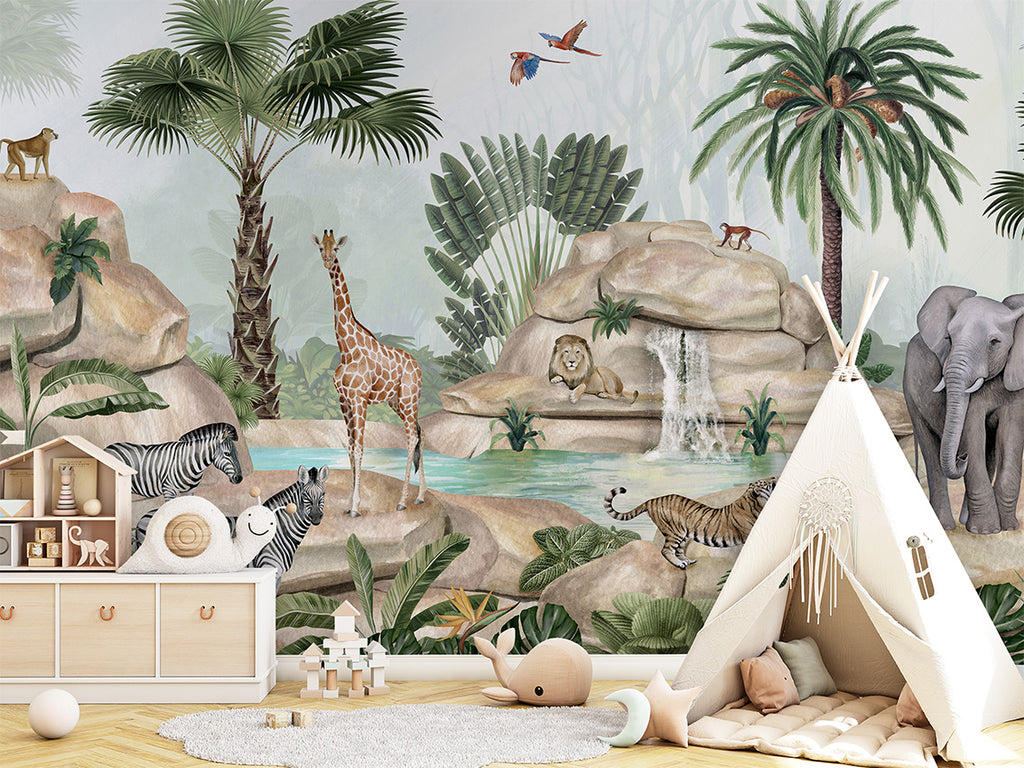 The "Welcome To The Zoo Mural" by Fentucci features a vibrant, whimsical zoo scene with playful animals and lush foliage, bringing a lively, artistic charm to any space. #luxurywallcoverings #creativeinteriors #fentucci