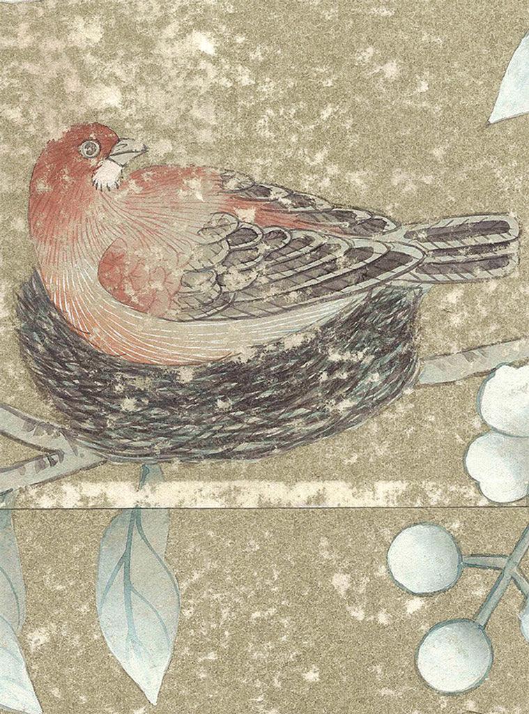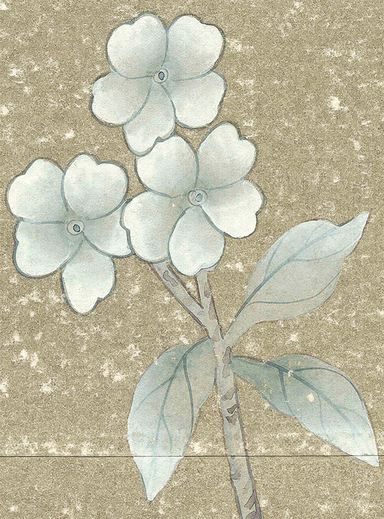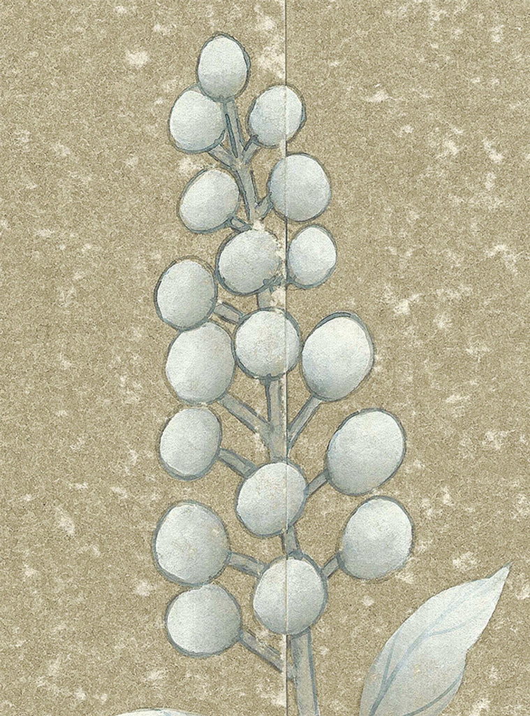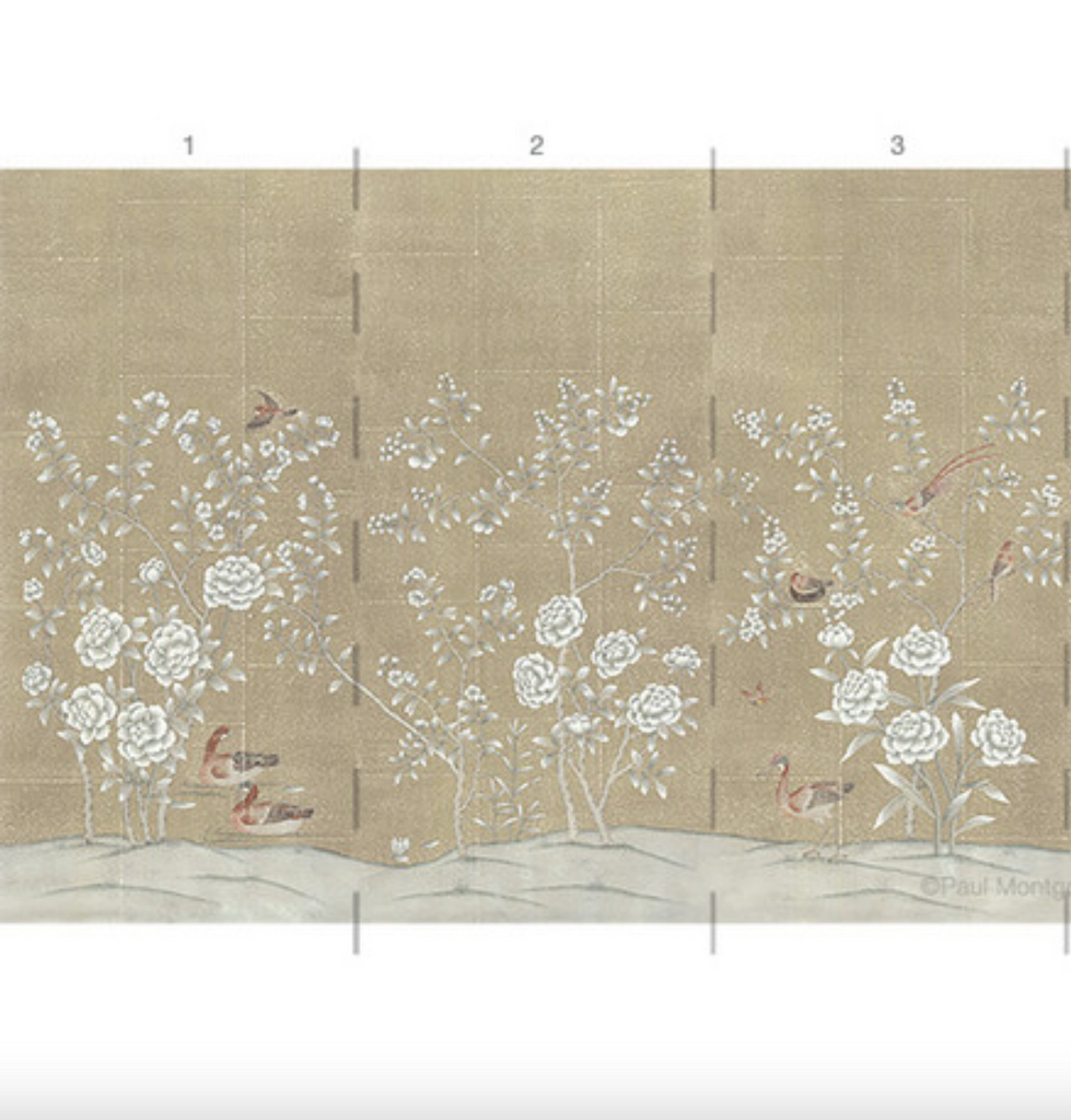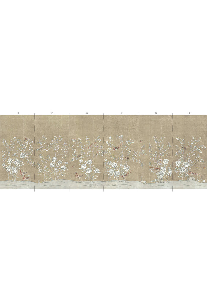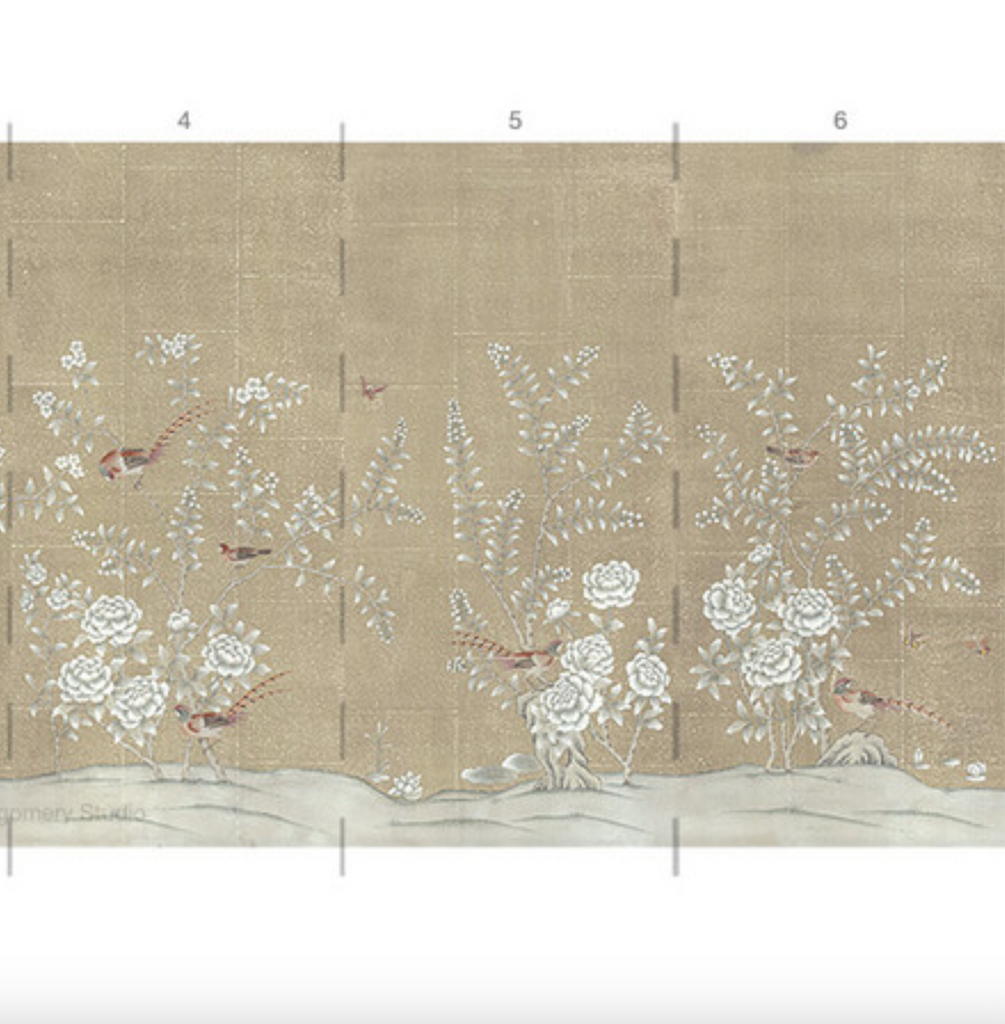 Nanjing Tea Paper is a textured chinoiserie mural with warm red and purple colored pheasants and peonies on a taupe grey background. 6 Panels Available in Full Length/Headers/Footers, Sold in individual Panels, Width: 36", Design Height: 72", Total Height: 52", Nanjing Tea Paper,Paul Montgomery Studios