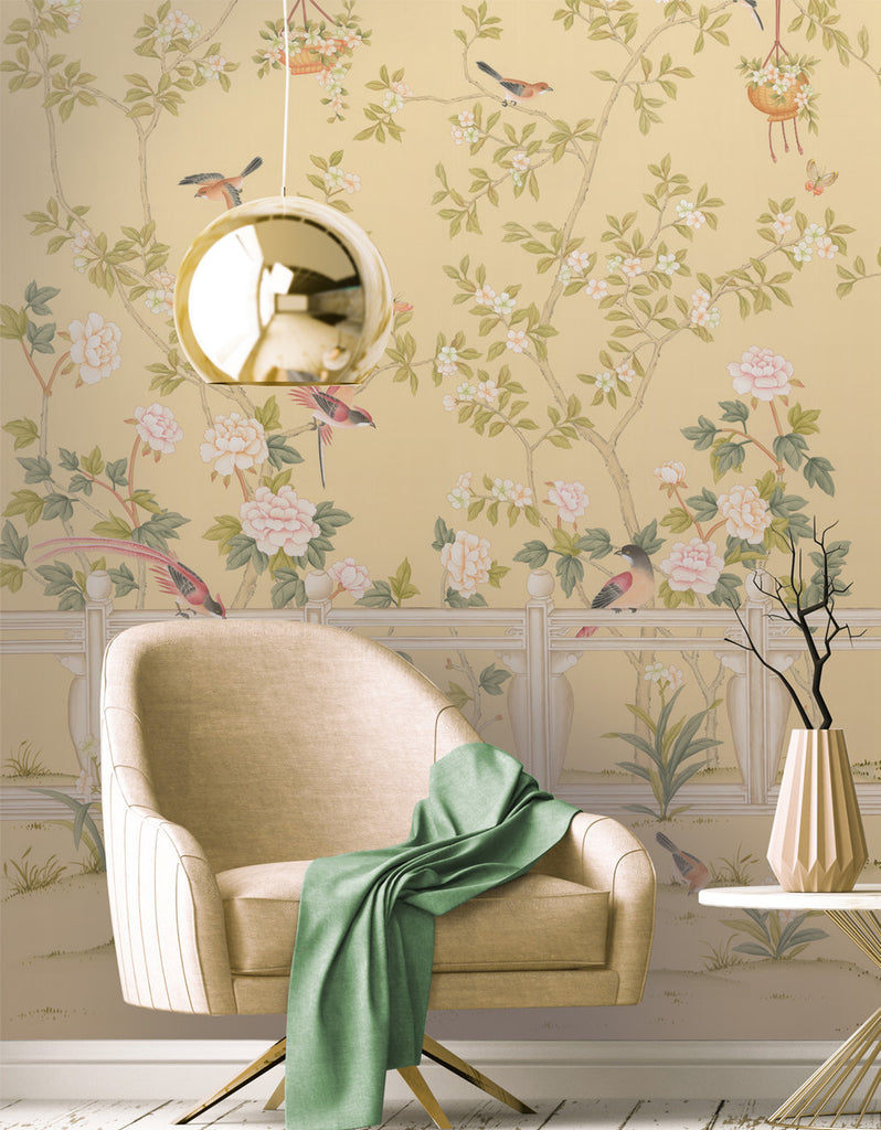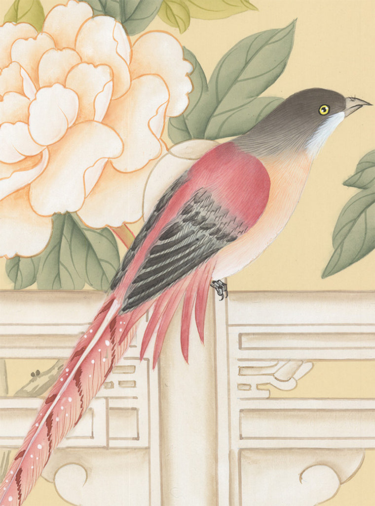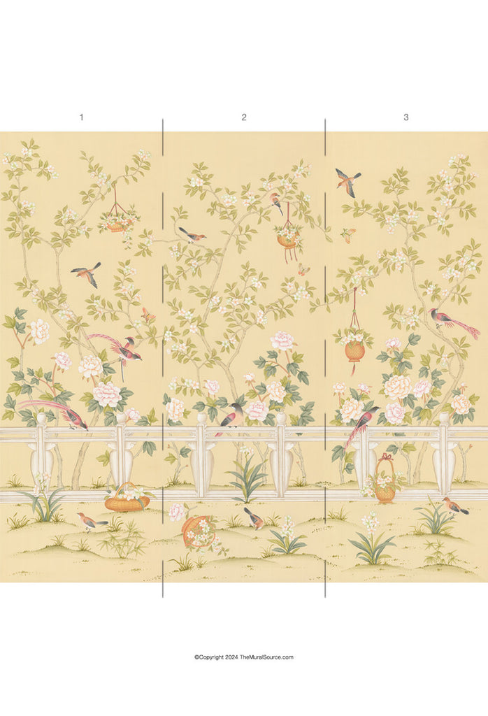 Our Orsay Triptych chinoiserie showcases delicate flowers and beautiful birds in an ornately fenced garden. 3 Panels Available in Full Length/Headers/Footers, Sold in individual Panels, Width: 36", Design Height: 100" 96", Total Height: 98", Orsay Triptych,Paul Montgomery Studios