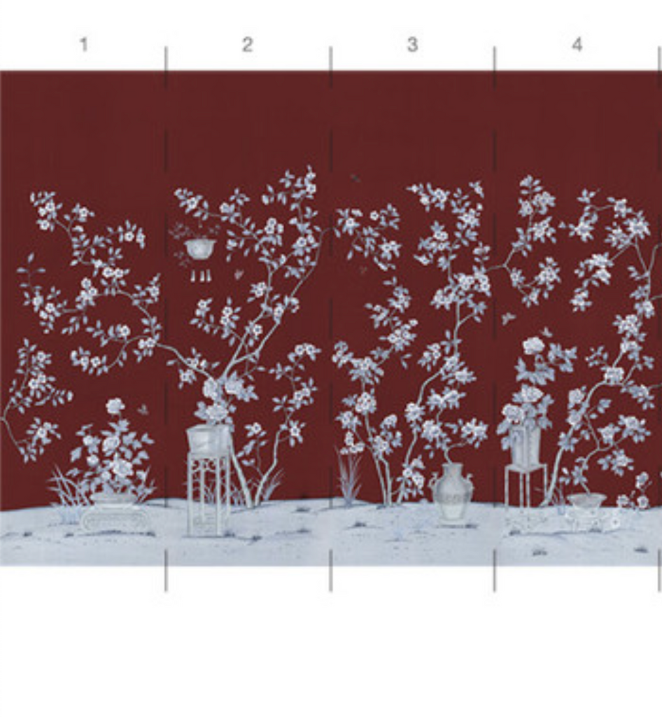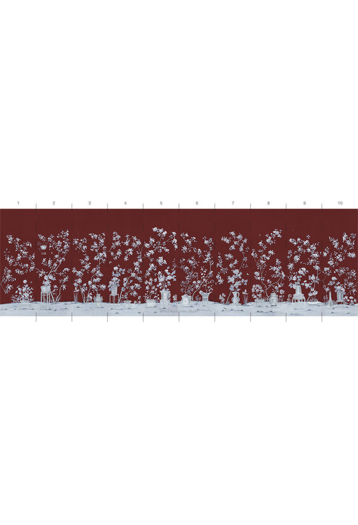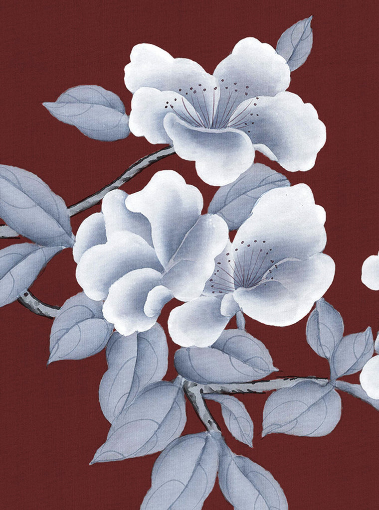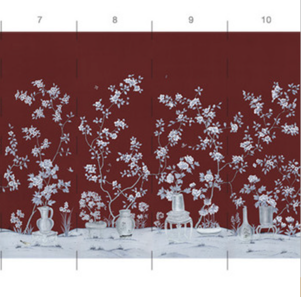 Our Porcelains chinoiserie mural wallpaper showcases delicate camellias and peonies alongside beautiful Chinese porcelain vases. 10 Panels Available in Full Length/Headers/Footers, Sold in individual Panels, Width: 36", Design Height: 108", Total Height: 90", Porcelains,Paul Montgomery Studios